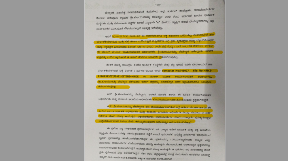 ಅಲ್ಲದೇ ಹಿಂದೂ ಧಾರ್ಮಿಕ ಸಂಸ್ಥೆಗಳು ಮತ್ತು ದತ್ತಿ ಇಲಾಖೆಯು ದೇವಾಲಯದ ಹಣ ದುರ್ಬಳಕೆಯಾಗಿರುವ ಬಗ್ಗೆ 2022ರ ಜೂನ್ 22ರರಂದು (ಕಂಪ್ಯೂಟರ್ ನಂ 748027 ಕಡತ ಸಂಖ್ಯೆ HRICE-ESTOEST3/37/2022-ESTEND-HRICE) ಮೂಲಕ ಹುಲಿಯೂರಮ್ಮ ದೇವಸ್ಥಾನದ ಕಾರ್ಯನಿರ್ವಾಹಕ ಅಧಿಕಾರಿಗಳಿಗೆ ಪತ್ರ ಬರೆದಿದೆ. ಆದರೆ ಇಲ್ಲಿಯವರೆಗೂ ಯಾವುದೇ ಕ್ರಮವಾಗಿಲ್ಲ ಎಂದು ದೂರಿನಲ್ಲಿ ಆರೋಪಿಸಲಾಗಿದೆ.