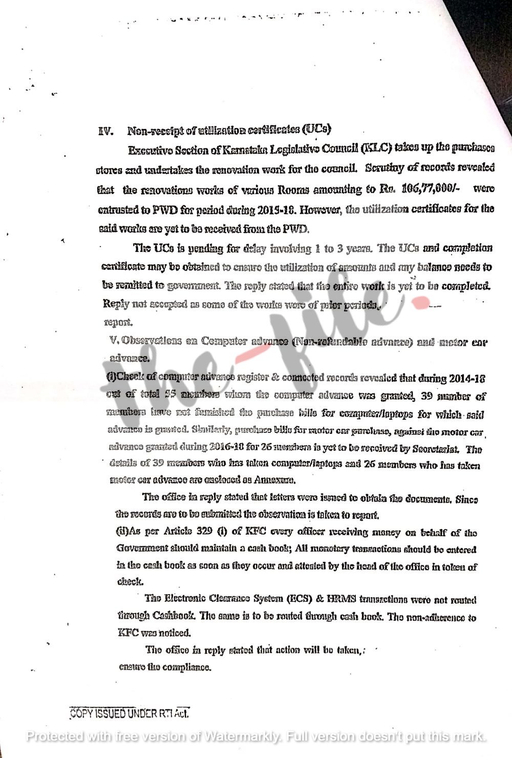 ಕಂಪ್ಯೂಟರ್‌/ಲ್ಯಾಪ್‌ಟಾಪ್‌ ಖರೀದಿಗೆ 2014-ರಿಂದ 2018ರವರೆಗೆ ಒಟ್ಟು 55 ಸದಸ್ಯರು ಮುಂಗಡ ಹಣ ಪಡೆದಿದ್ದರು. ಈ ಪೈಕಿ 39 ಸದಸ್ಯರು ಉಪಕರಣಗಳ ಖರೀದಿಸಿರುವ ಸಂಬಂಧ ಯಾವುದೇ ದಾಖಲೆಗಳನ್ನು ಒದಗಿಸಿಲ್ಲ ಮತ್ತು ಈ ಸಂಬಂಧ ಸಚಿವಾಲಯದ ಅಧಿಕಾರಿಗಳು ಕ್ಯಾಶ್‌ ಬುಕ್‌ನ್ನು ನಿರ್ವಹಿಸಿಲ್ಲ ಎಂಬುದನ್ನು ಲೆಕ್ಕ ಪರಿಶೋಧಕರು ವರದಿಯಲ್ಲಿ ಬಹಿರಂಗಗೊಳಿಸಿದ್ದಾರೆ.