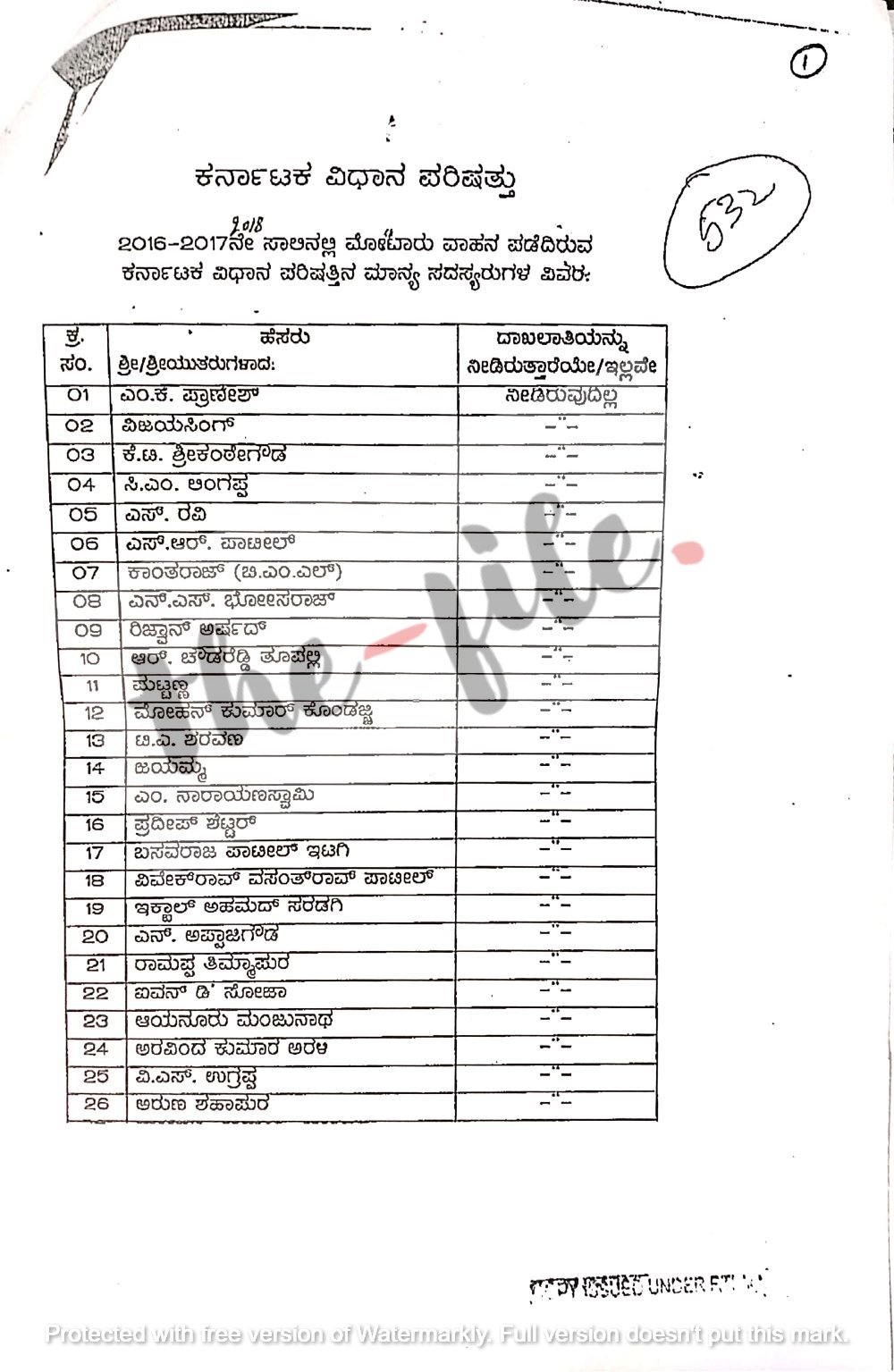 ಎನ್‌ ಎಸ್‌ ಭೋಸರಾಜ್‌, ಹೆಚ್‌ ಎಂ ರೇವಣ್ಣ, ಡಿ ಯು ಮಲ್ಲಿಕಾರ್ಜುನ್‌, ಐವನ್‌ ಡಿಸೋಜಾ, ನಸೀರ್‌ ಅಹ್ಮದ್‌, ಟಿ ಜಾನ್‌, ಮೋಟಮ್ಮ, ವಿಜಯಸಿಂಗ್‌, ಬಿ ಜಿ ಪಾಟೀಲ್‌, ಬಸವನಗೌಡ ಆರ್‌ ಪಾಟೀಲ್‌ (ಯತ್ನಾಳ್‌), ಕೆ ಸಿ ಕೊಂಡಯ್ಯ, ಎಂ ಕೆ ಪ್ರಾಣೇಶ್‌, ಎಂ ಎ ಗೋಪಾಲಸ್ವಾಮಿ, ಕಾಂತರಾಜ್‌ (ಬಿಎಂಎಲ್‌), ಎಂ ನಾರಾಯಣಸ್ವಾಮಿ, ಎಸ್‌ ರವಿ, ಕವಟಗಿಮಠ ಮಹಾಂತೇಶ ಮಲ್ಲಿಕಾರ್ಜುನ, ಘೋಟ್ನೇಕರ ಶ್ರೀಕಾಂತ್‌ ಲಕ್ಷ್ಮಣ, ಜಿ ರಘು ಅಚಾರ್‌, ಕೋಟ ಶ್ರೀನಿವಾಸ ಪೂಜಾರಿ, ಆರ್‌ ಧರ್ಮಸೇನ, ಎಸ್‌ ನಾಗರಾಜ್‌ (ಸಂದೇಶ್‌ ನಾಗರಾಜ್‌), ಪಿ ಆರ್‌ ರಮೇಶ್‌ ಅವರು ದಾಖಲೆಗಳನ್ನು ಒದಗಿಸಿಲ್ಲ ಎಂಬುದು ಸಿಎಜಿ ವರದಿಯಿಂದ ಗೊತ್ತಾಗಿದೆ.
