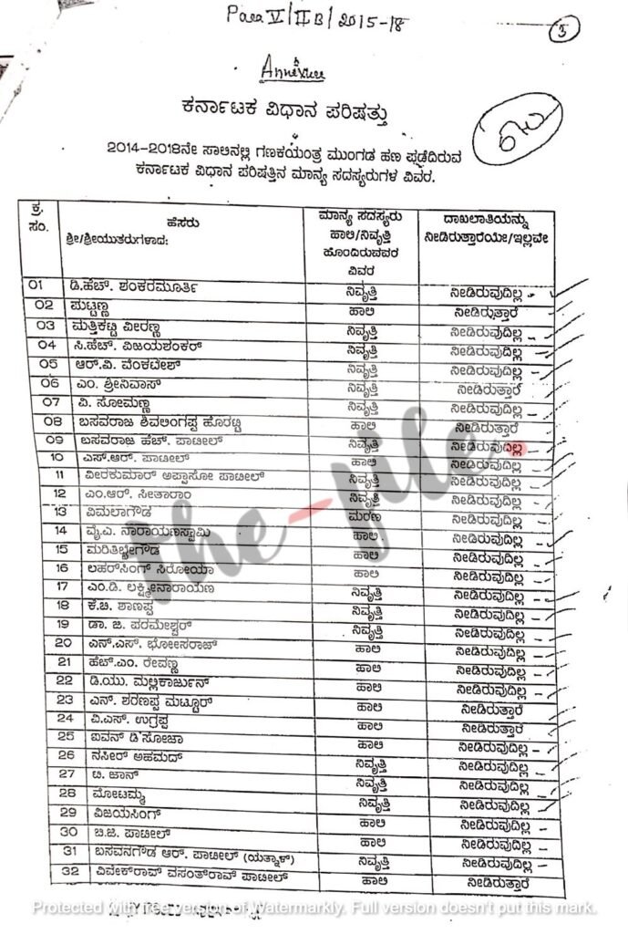 ಎನ್‌ ಎಸ್‌ ಭೋಸರಾಜ್‌, ಹೆಚ್‌ ಎಂ ರೇವಣ್ಣ, ಡಿ ಯು ಮಲ್ಲಿಕಾರ್ಜುನ್‌, ಐವನ್‌ ಡಿಸೋಜಾ, ನಸೀರ್‌ ಅಹ್ಮದ್‌, ಟಿ ಜಾನ್‌, ಮೋಟಮ್ಮ, ವಿಜಯಸಿಂಗ್‌, ಬಿ ಜಿ ಪಾಟೀಲ್‌, ಬಸವನಗೌಡ ಆರ್‌ ಪಾಟೀಲ್‌ (ಯತ್ನಾಳ್‌), ಕೆ ಸಿ ಕೊಂಡಯ್ಯ, ಎಂ ಕೆ ಪ್ರಾಣೇಶ್‌, ಎಂ ಎ ಗೋಪಾಲಸ್ವಾಮಿ, ಕಾಂತರಾಜ್‌ (ಬಿಎಂಎಲ್‌), ಎಂ ನಾರಾಯಣಸ್ವಾಮಿ, ಎಸ್‌ ರವಿ, ಕವಟಗಿಮಠ ಮಹಾಂತೇಶ ಮಲ್ಲಿಕಾರ್ಜುನ, ಘೋಟ್ನೇಕರ ಶ್ರೀಕಾಂತ್‌ ಲಕ್ಷ್ಮಣ, ಜಿ ರಘು ಅಚಾರ್‌, ಕೋಟ ಶ್ರೀನಿವಾಸ ಪೂಜಾರಿ, ಆರ್‌ ಧರ್ಮಸೇನ, ಎಸ್‌ ನಾಗರಾಜ್‌ (ಸಂದೇಶ್‌ ನಾಗರಾಜ್‌), ಪಿ ಆರ್‌ ರಮೇಶ್‌ ಅವರು ದಾಖಲೆಗಳನ್ನು ಒದಗಿಸಿಲ್ಲ ಎಂಬುದು ಸಿಎಜಿ ವರದಿಯಿಂದ ಗೊತ್ತಾಗಿದೆ.