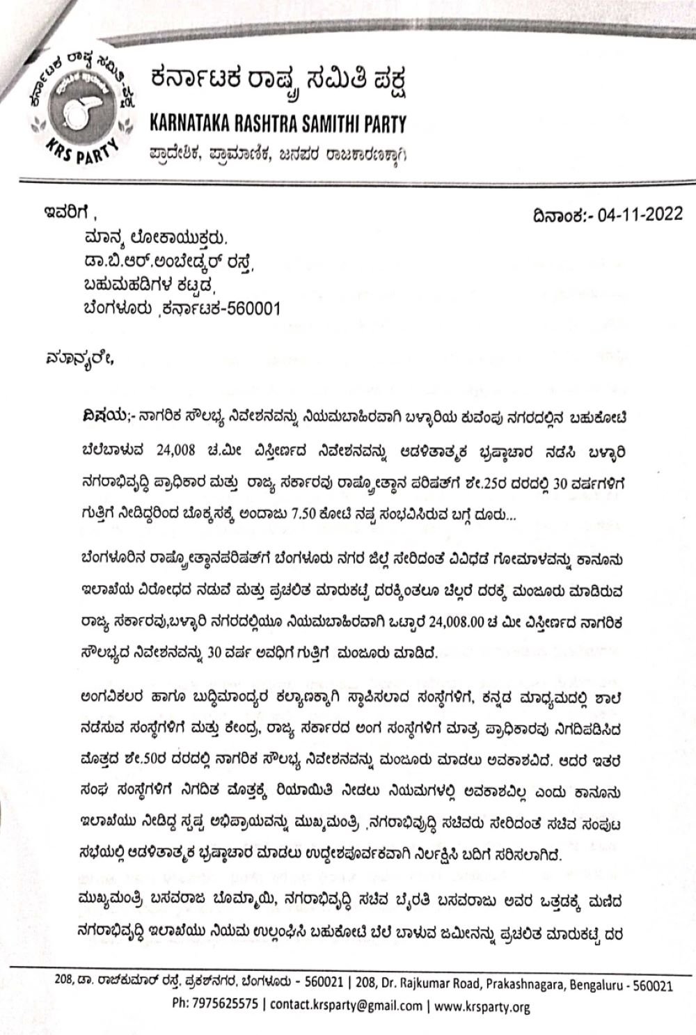 ಮುಖ್ಯಮಂತ್ರಿ ಬಸವರಾಜ ಬೊಮ್ಮಾಯಿ, ನಗರಾಭಿವೃದ್ಧಿ ಸಚಿವ ಬೈರತಿ ಬಸವರಾಜು ಅವರ ಒತ್ತಡಕ್ಕೆ ಮಣಿದ ಇಲಾಖೆಯು ನಿಯಮ ಉಲ್ಲಂಘಿಸಿ ಬಹುಕೋಟಿ ಬೆಲೆ ಬಾಳುವ ಜಮೀನನ್ನು ಪ್ರಚಲಿತ ಮಾರುಕಟ್ಟೆ ದರ ಶೇ. 25ರಷ್ಟು ದರಕ್ಕೆ ಮಂಜೂರು ಮಾಡಿರುವುದರ ಹಿಂದೆ ಅಧಿಕಾರಿಗಳ ಕರ್ತವ್ಯಲೋಪ ಮತ್ತು ಇದರಲ್ಲಿ ಭ್ರಷ್ಟಾಚಾರ ನಡೆದಿದೆ ಎಂದು ಕರ್ನಾಟಕ ರಾಷ್ಟ್ರಸಮಿತಿಯು ದೂರಿನಲ್ಲಿ ಆಪಾದಿಸಿದೆ.
