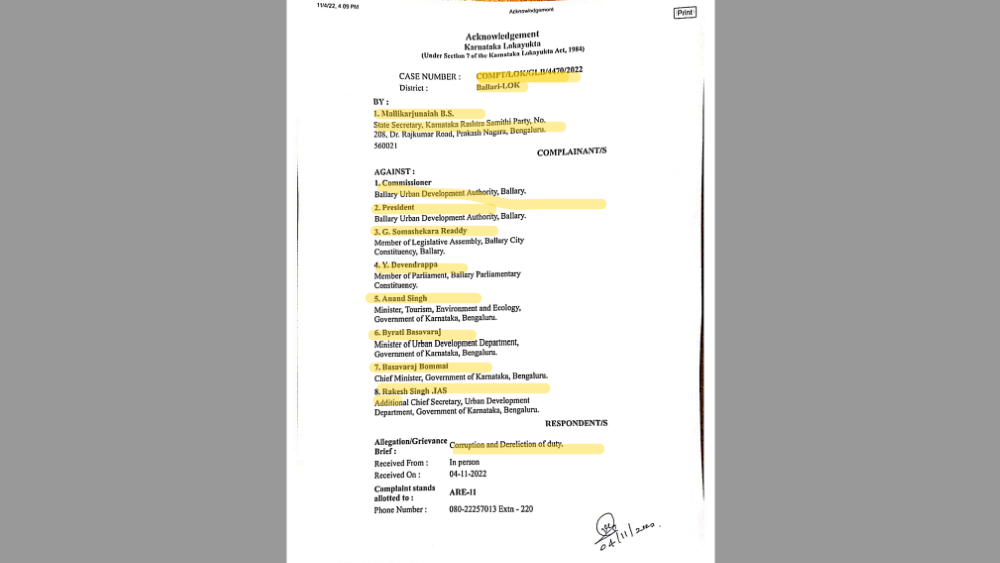ಕರ್ತವ್ಯಲೋಪ ಮತ್ತು ಭ್ರಷ್ಟಾಚಾರ ಆರೋಪದ ಅಡಿಯಲ್ಲಿ ದೂರು ದಾಖಲಿಸಿರುವ ಕರ್ನಾಟಕ ರಾಷ್ಟ್ರಸಮಿತಿಯ ರಾಜ್ಯ ಕಾರ್ಯದರ್ಶಿ ಬಿ ಎಸ್ ಮಲ್ಲಿಕಾರ್ಜುನಯ್ಯ ಅವರು ಬಳ್ಳಾರಿ ನಗರದ ಶಾಸಕ ಜಿ ಸೋಮಶೇಖರ ರೆಡ್ಡಿ, ಸಂಸದ ವೈ ದೇವೇಂದ್ರಪ್ಪ, ಬಳ್ಳಾರಿ ನಗರಾಭಿವೃದ್ಧಿ ಪ್ರಾಧಿಕಾರದ ಅಧ್ಯಕ್ಷ, ಆಯುಕ್ತ, ನಗರಾಭಿವೃದ್ಧಿ ಇಲಾಖೆಯ ಸರ್ಕಾರದ ಹೆಚ್ಚುವರಿ ಮುಖ್ಯ ಕಾರ್ಯದರ್ಶಿ ರಾಕೇಶ್ ಸಿಂಗ್ ಅವರನ್ನೂ ಪ್ರತಿವಾದಿಯನ್ನಾಗಿಸಿದ್ದಾರೆ. ದೂರಿನ ಪ್ರತಿಯು ‘ದಿ ಫೈಲ್’ಗೆ ಲಭ್ಯವಾಗಿದೆ.
