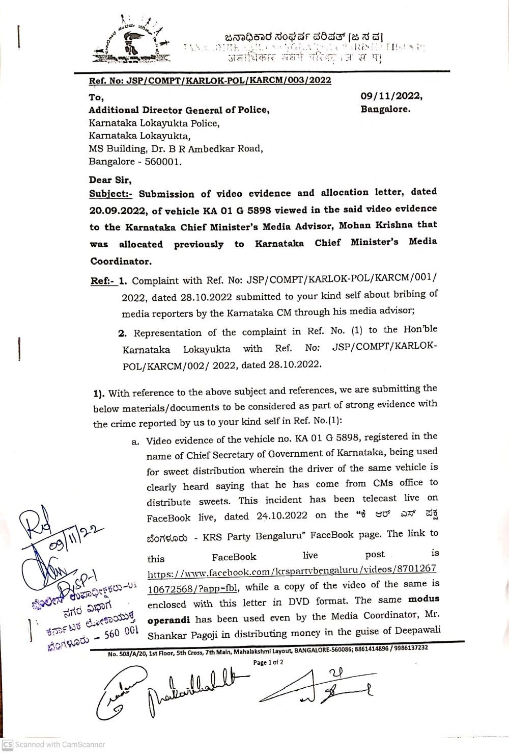 ಈಗಾಗಲೇ ಇದೇ ಪ್ರಕರಣಕ್ಕೆ ಸಂಬಂಧಿಸಿದಂತೆ ಜನಾಧಿಕಾರ ಸಂಘರ್ಷ ಪರಿಷತ್ ಮುಖ್ಯಮಂತ್ರಿ ಬಸವರಾಜ ಬೊಮ್ಮಾಯಿ ಮತ್ತು ಮಾಧ್ಯಮ ಸಂಯೋಜಕ ಶಂಕರ ಪಾಗೋಜಿ ಎಂಬುವರ ವಿರುದ್ಧ ಲೋಕಾಯುಕ್ತದಲ್ಲಿ ಈಗಾಗಲೇ ದೂರು ದಾಖಲಿಸಿದೆ. ಆದರೂ ಲೋಕಾಯುಕ್ತ ಬಿ ಎಸ್ ಪಾಟೀಲ್ ಅವರಾಗಲೀ, ಲೋಕಾಯುಕ್ತ ಎಡಿಜಿಪಿ ಪ್ರಶಾಂತಕುಮಾರ್ ಠಾಕೂರ್ ಆಗಲಿ ಲೋಕಾಯುಕ್ತ ಪೊಲೀಸ್ ಬೆಂಗಳೂರು ವಿಭಾಗದ ಡಿವೈಎಸ್ಪಿ ಆಂತೋಣಿ ಎಂಬುವರಿಗೆ ಇದುವರೆಗೂ ಯಾವುದೇ ಮಾಹಿತಿಯನ್ನು ನೀಡಿಲ್ಲ ಮತ್ತು ಚರ್ಚೆಯನ್ನೂ ನಡೆಸಿಲ್ಲ ಎಂದು ಗೊತ್ತಾಗಿದೆ.