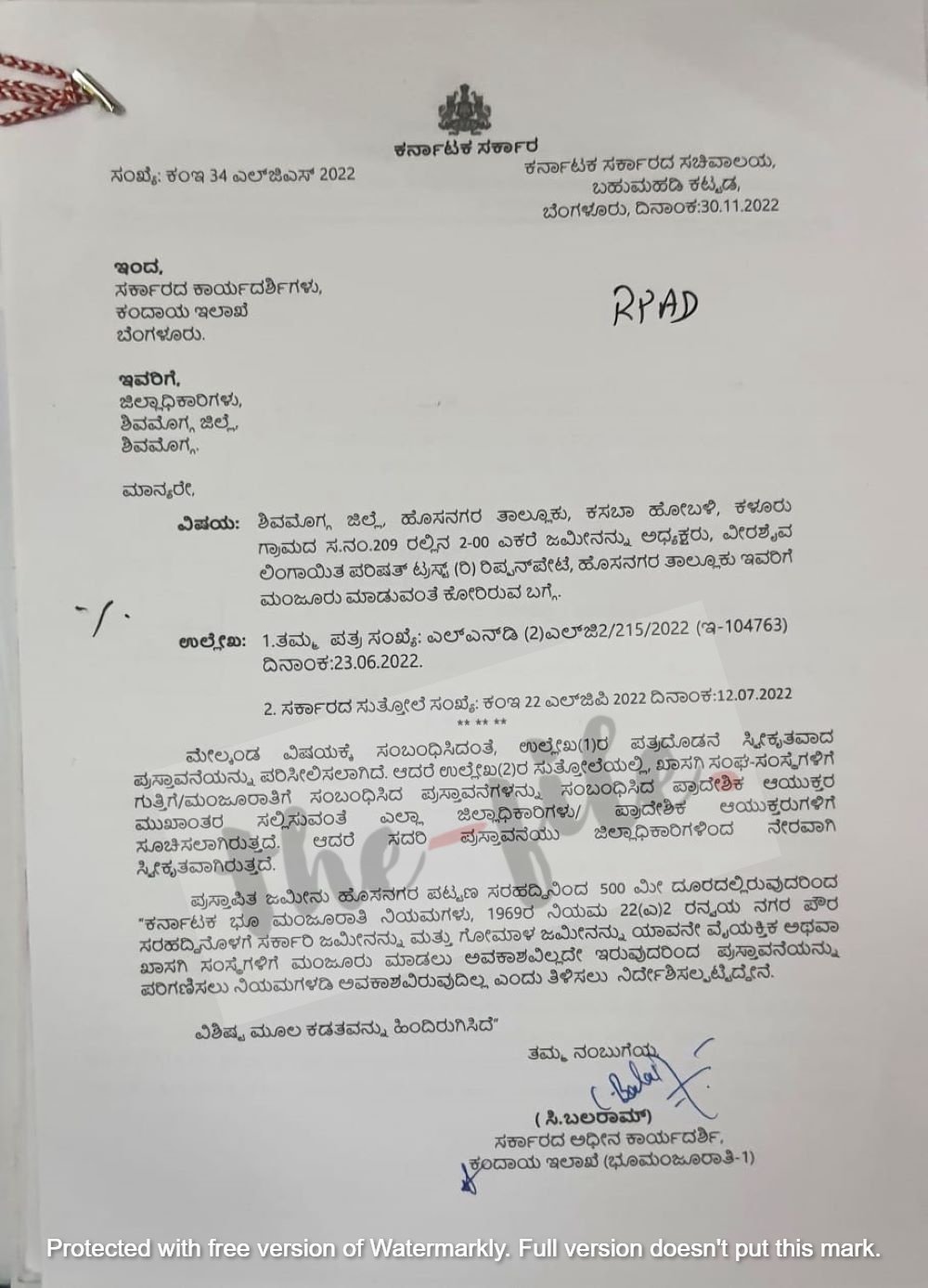 ಈ ಸಂಬಂಧ ಕಂದಾಯ ಇಲಾಖೆಯ ಸರ್ಕಾರದ ಅಧೀನ ಕಾರ್ಯದರ್ಶಿ 2022ರ ನವೆಂಬರ್‌ 30ರಂದು ಶಿವಮೊಗ್ಗ ಜಿಲ್ಲಾಧಿಕಾರಿಗೆ ಪತ್ರ (ಪತ್ರ ಸಂಖ್ಯೆ; ಕಂಇ 34 ಎಲ್‌ಜಿಎಸ್‌ 2022) ಬರೆದಿದ್ದಾರೆ ಎಂದು ಗೊತ್ತಾಗಿದೆ.