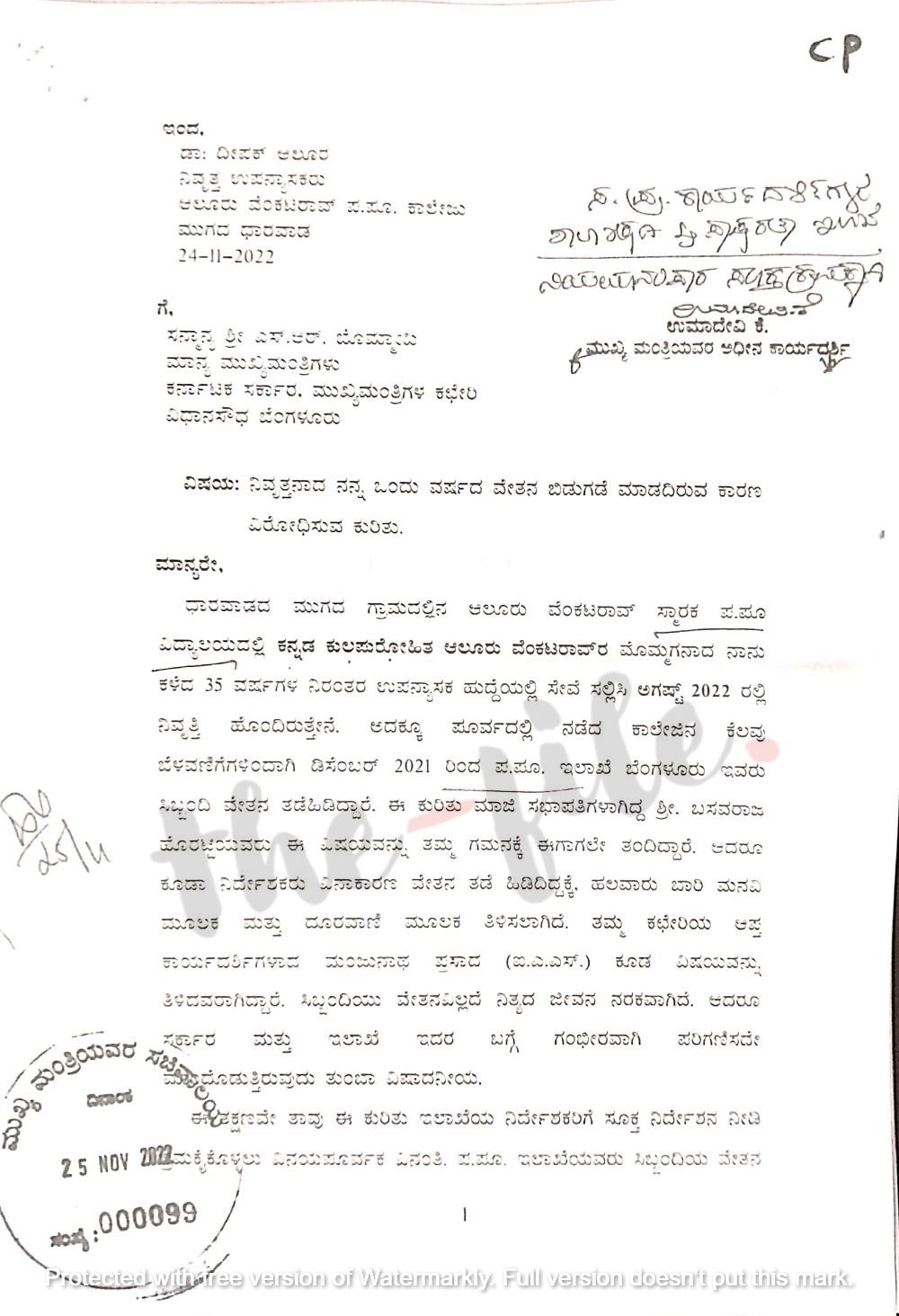 ಈ ಸಂಬಂಧ ಮುಖ್ಯಮಂತ್ರಿ ಬಸವರಾಜ ಬೊಮ್ಮಾಯಿ ಮತ್ತು ಅವರ ಪ್ರಧಾನ ಕಾರ್ಯದರ್ಶಿ ಮಂಜುನಾಥ ಪ್ರಸಾದ್ ಹಾಗೂ ಪದವಿಪೂರ್ವ ಶಿಕ್ಷಣ ಇಲಾಖೆಯ ನಿರ್ದೇಶಕರಿಗೆ 2022ರ ನವಂಬರ್ 25ರಂದು ಪತ್ರ ಬರೆದಿದ್ದಾರೆ. ಈ ಪತ್ರದ ಪ್ರತಿಯು ‘ದಿ ಫೈಲ್’ಗೆ ಲಭ್ಯವಾಗಿದೆ.