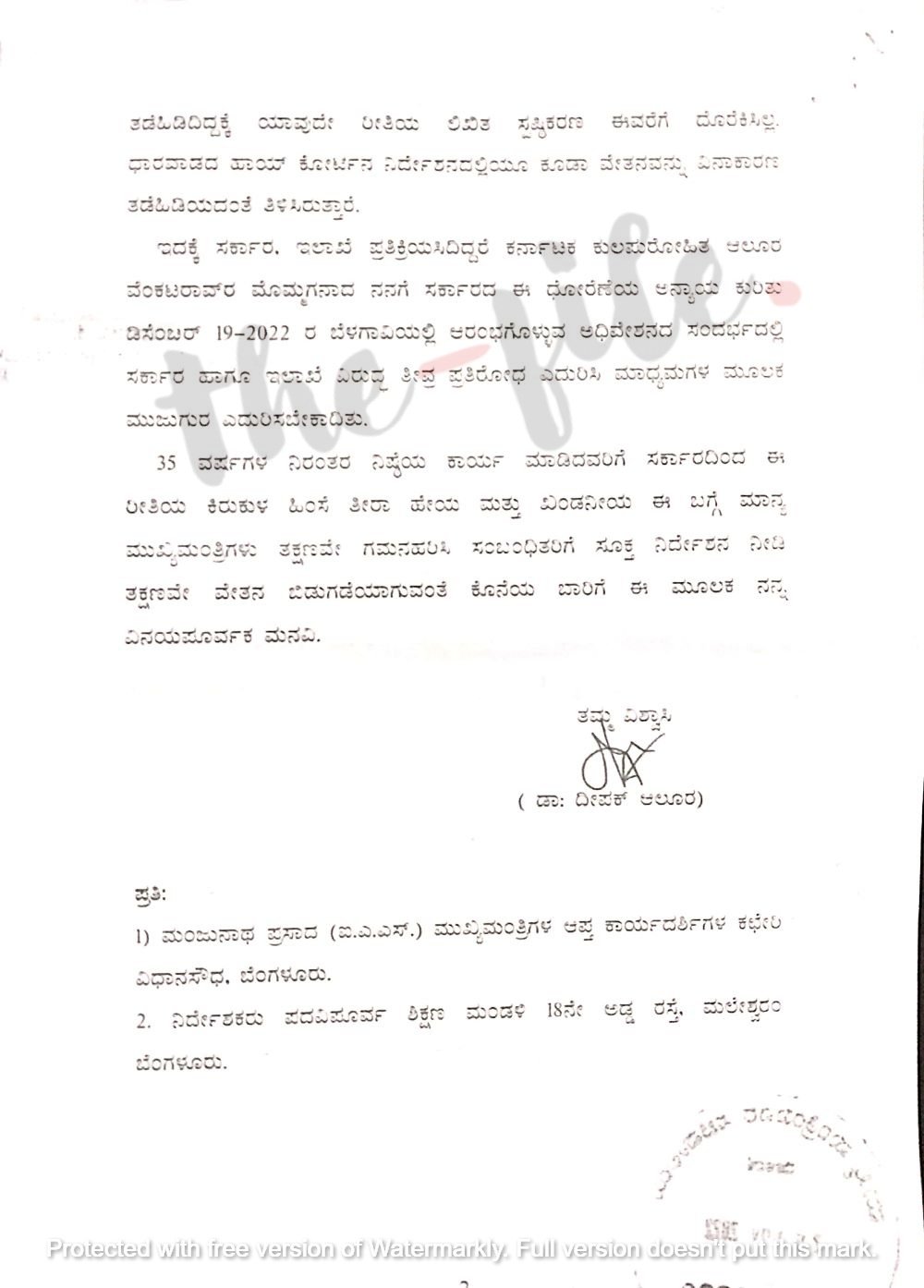 ’35 ವರ್ಷಗಳ ನಿರಂತರ ನಿಷ್ಠೆಯ ಕಾರ್ಯ ಮಾಡಿದವರಿಗೆ ಸರ್ಕಾರದಿಂದ ಈ ರೀತಿಯ ಕಿರುಕುಳ, ಹಿಂಸೆ, ತೀರಾ ಹೇಯ ಮತ್ತು ಖಂಡನೀಯ. ಈ ಬಗ್ಗೆ ಮುಖ್ಯಮಂತ್ರಿಗಳು ತಕ್ಷಣವೇ ಗಮನಹರಿಸಿ ತಕ್ಷಣವೇ ವೇತನ ಬಿಡುಗಡೆ ಮಾಡಲು ಸಂಬಂಧಿತರಿಗೆ ನಿರ್ದೇಶನ ನೀಡಬೇಕು. ಕೊನೆಯ ಬಾರಿಗೆ ಈ ಮೂಲಕ ವಿನಯಪೂರ್ವಕವಾಗಿ ಮನವಿ ಮಾಡಿಕೊಳ್ಳುತ್ತೇನೆ,’ ಎಂದು ಡಾ ದೀಪಕ್ ಆಲೂರ ಅವರು ಪತ್ರದಲ್ಲಿ ಕೋರಿದ್ದಾರೆ.
