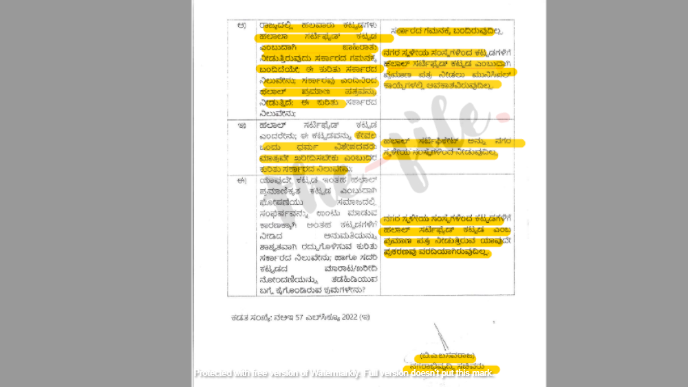 ಈ ಎಲ್ಲಾ ಪ್ರಶ್ನೆಗಳಿಗೂ ಉತ್ತರಿಸಿರುವ ನಗರಾಭಿವೃದ್ಧಿ ಸಚಿವ ಬೈರತಿ ಬಸವರಾಜು ಅವರು ‘ಹಲಾಲ್‌ ಸರ್ಟಿಫಿಕೇಟ್‌ನ್ನು ನಗರ ಸ್ಥಳೀಯ ಸಂಸ್ಥೆಗಳಿಂದ ನೀಡುವುದಿಲ್ಲ. ನಗರ ಸ್ಥಳೀಯ ಸಂಸ್ಥೆಗಳಿಂದ ಕಟ್ಟಡಗಳಿಗೆ ಹಲಾಲ್‌ ಸರ್ಟಿಫೈಡ್‌ ಕಟ್ಟಡ ಎಂಬ ಪ್ರಮಾಣ ಪತ್ರ ನೀಡುತ್ತಿರುವ ಯಾವುದೇ ಪ್ರಕರಣವೂ ವರದಿಯಾಗಿರುವುದಿಲ್ಲ,’ ಎಂದು ಸ್ಪಷ್ಟವಾಗಿ ಉತ್ತರಿಸಿದ್ದಾರೆ.