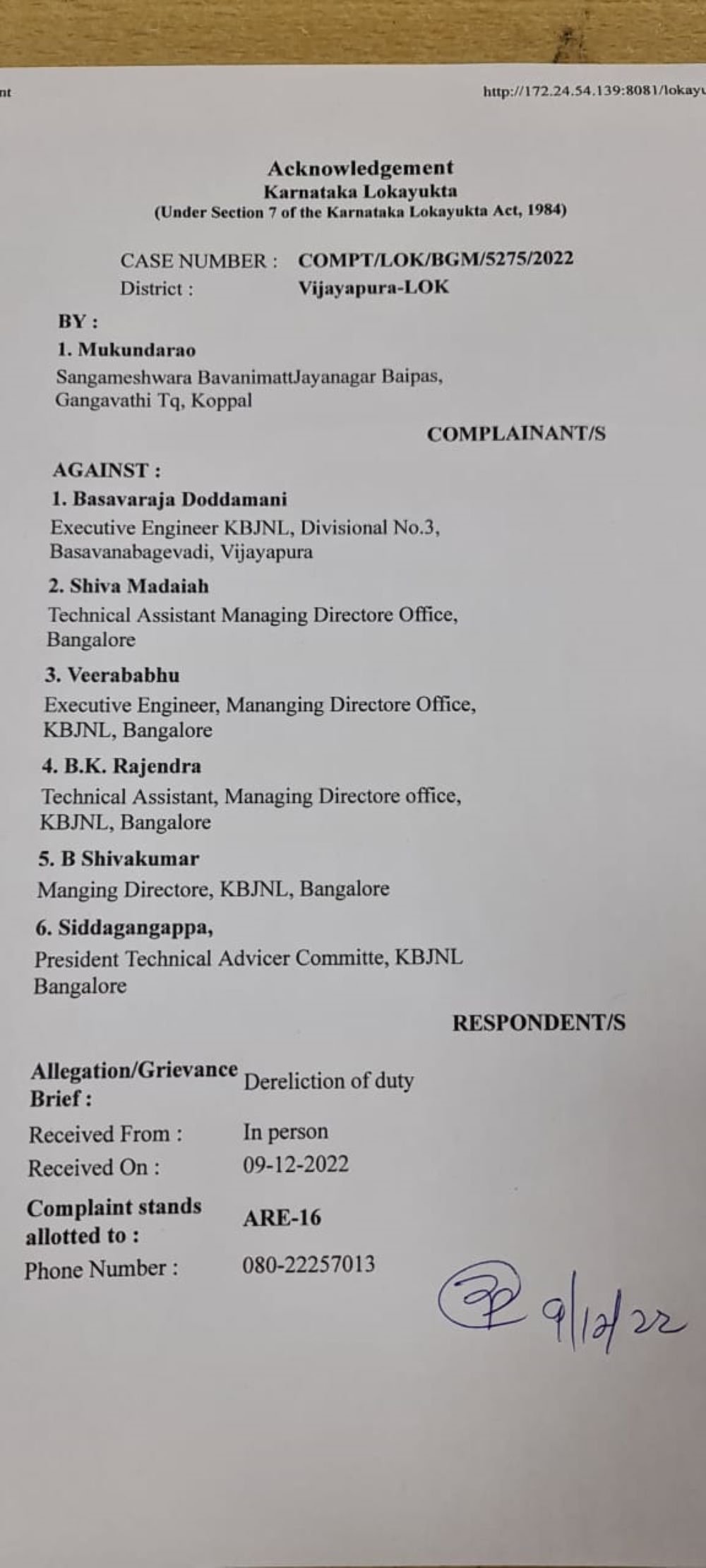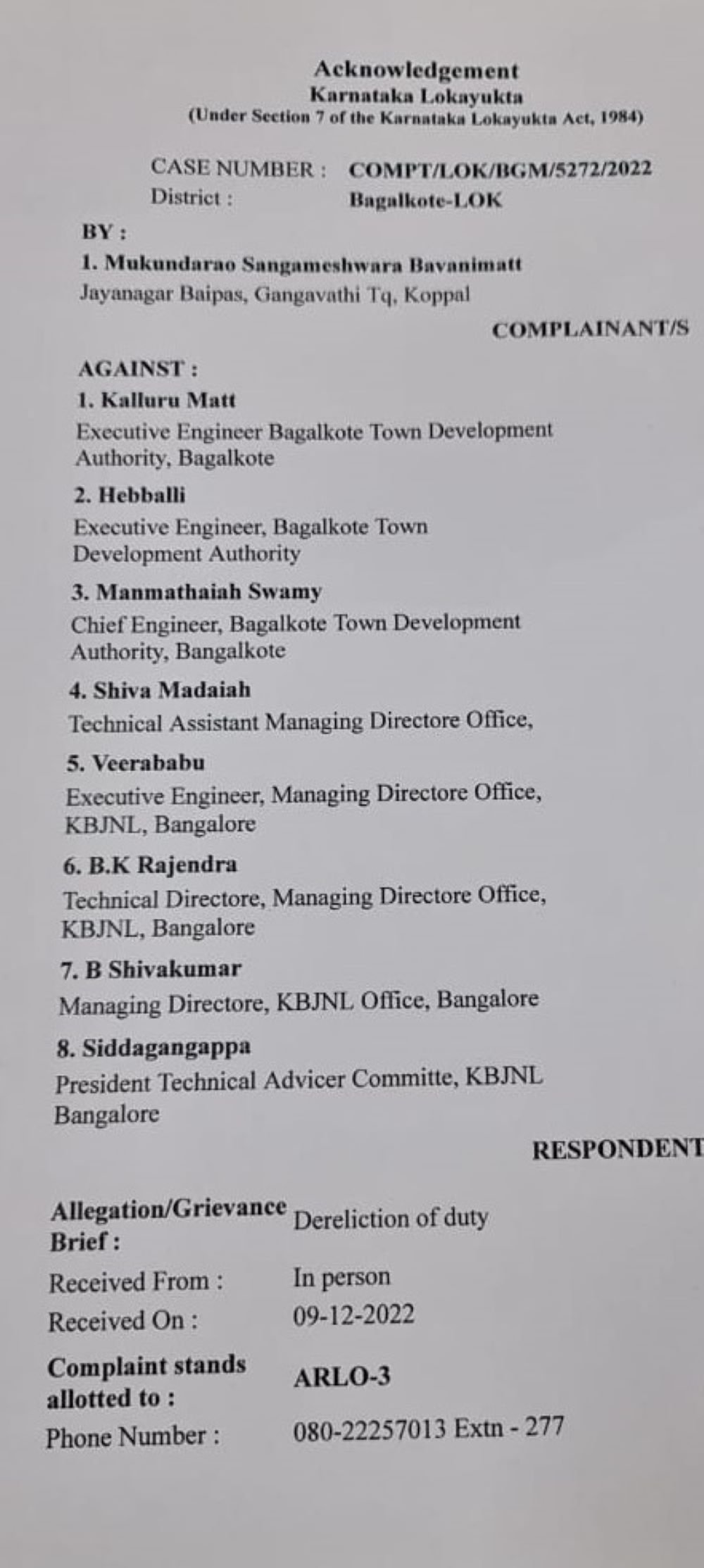 ಈ ಪ್ರಕ್ರಿಯೆಯಲ್ಲಿ ಬಾಗಲಕೋಟೆ ಪಟ್ಟಣ ಅಭಿವೃದ್ಧಿ ಪ್ರಾಧಿಕಾರದ ಕಾರ್ಯನಿರ್ವಾಹಕ ಇಂಜನಿಯರ್‌ ಕಲ್ಲೂರ ಮಠ, ಮುಖ್ಯ ಇಂಜನಿಯರ್‌ ಮನ್ಮಥಯ್ಯ ಸ್ವಾಮಿ, ಕೆಬಿಜೆಎನ್‌ಎಲ್‌ನ ವ್ಯವಸ್ಥಾಪಕ ನಿರ್ದೇಶಕರ ಕಚೇರಿಯಲ್ಲಿನ ತಾಂತ್ರಿಕ ಸಹಾಯಕ ಶಿವ ಮಾದಯ್ಯ, ವೀರಬಾಬು, ತಾಂತ್ರಿಕ ನಿರ್ದೇಶಕ ಬಿ ಕೆ ರಾಜೇಂದ್ರ, ಕೆಬಿಜೆಎನ್‌ಎಲ್‌ನ ವ್ಯವಸ್ಥಾಪಕ ನಿರ್ದೇಶಕ ಬಿ ಶಿವಕುಮಾರ್‌, ತಾಂತ್ರಿಕ ಸಲಹಾ ಸಮಿತಿ ಅಧ್ಯಕ್ಷ ಸಿದ್ದಗಂಗಪ್ಪ ಅವರು ಗುತ್ತಿಗೆದಾರರ ಸಂಸ್ಥೆಯೊಂದಿಗೆ ಅಕ್ರಮವಾಗಿ ಶಾಮೀಲಾಗಿದ್ದಾರೆ ಎಂದು ಆರೋಪಿಸಲಾಗಿದೆ.