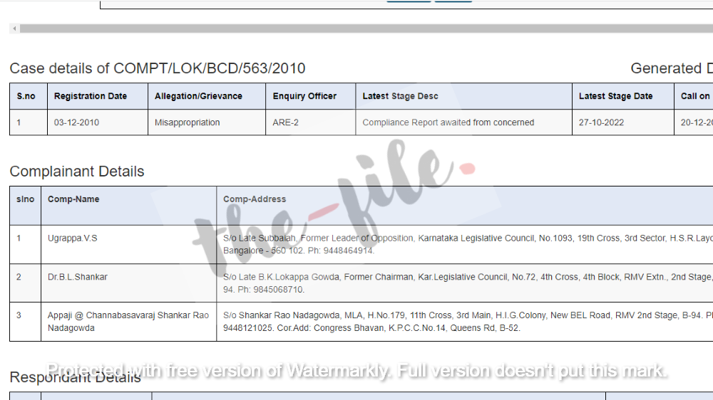 ಈ ಕುರಿತು ‘ದಿ ಫೈಲ್’ ಕೂಡ ಪರೀಕ್ಷೆಗೊಳಪಡಿಸಿತಲ್ಲದೇ ಲೋಕಾಯುಕ್ತ ಸಂಸ್ಥೆಯ ಅಧಿಕೃತ ಜಾಲತಾಣಕ್ಕೆ ಭೇಟಿ ಕೊಟ್ಟಿತು. 2010ರ ಡಿಸೆಂಬರ್ 3ರಂದು ವಿಧಾನಪರಿಷತ್ನ ಪ್ರತಿಪಕ್ಷ ನಾಯಕರಾಗಿದ್ದ ವಿ ಎಸ್ ಉಗ್ರಪ್ಪ, ಬಿ ಎಲ್ ಶಂಕರ್, ಅಪ್ಪಾಜಿ ಚನ್ನಬಸವರಾಜ ನಾಡಗೌಡ ಅವರು ದೂರು ದಾಖಲಿಸಿರುವುದನ್ನು ಲೋಕಾಯುಕ್ತ ಅಧಿಕೃತ ಜಾಲತಾಣದಲ್ಲಿ ಪ್ರಕಟಿಸಿರುವುದು ತಿಳಿದು ಬಂದಿದೆ.