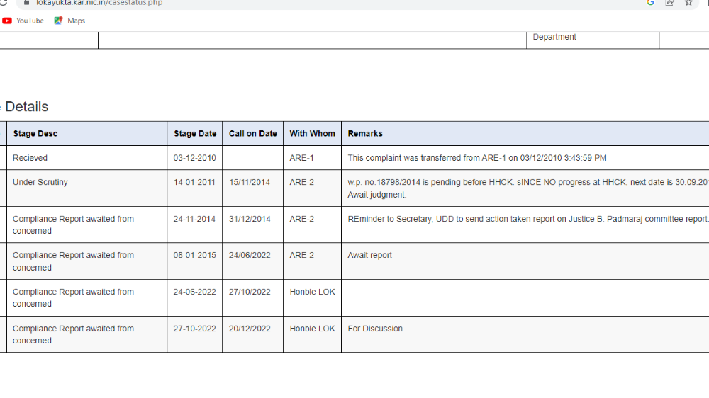 ಲೋಕಾಯುಕ್ತ ಸಂಸ್ಥೆಗೆ 2010ರ ಡಿಸೆಂಬರ್ 3ರಂದು ಸಲ್ಲಿಕೆಯಾಗಿದ್ದ ದೂರನ್ನು ಹೆಚ್ಚುವರಿ ವಿಚಾರಣಾಧಿಕಾರಿಗಳಿಗೆ (1) ರವಾನಿಸಲಾಗಿತ್ತು. ಈ ದೂರನ್ನು 2011ರ ಜನವರಿ 14ರಂದು ಪರಿಶೀಲನೆಗಿರಿಸಲಾಗಿತ್ತು. ಇದಾಗಿ 3 ವರ್ಷದ ನಂತರ ಅಂದರೆ 2014ರ ನವೆಂಬರ್ 15ರಂದು ವಿಚಾರಣೆಗೆ ದಿನಾಂಕ ನಿಗದಿಪಡಿಸಲಾಗಿತ್ತು.