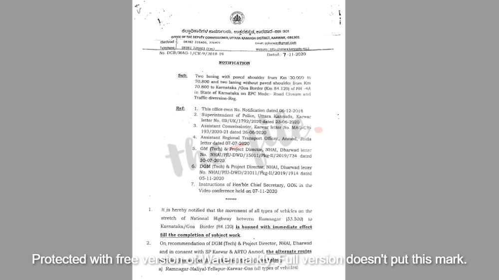 ಉತ್ತರ ಕನ್ನಡ ಜಿಲ್ಲೆಯ ರಾಮನಗರ-ಅನಮೋಡ್ ಮಾರ್ಗದಲ್ಲಿ ವಾಹನಗಳ ಸಂಚಾರವನ್ನು ಸಂಪೂರ್ಣವಾಗಿ ನಿರ್ಬಂಧಿಸಿ ಉತ್ತರ ಕನ್ನಡ ಜಿಲ್ಲೆಯ ಜಿಲ್ಲಾಧಿಕಾರಿಯಾಗಿದ್ದ ಡಾ ಕೆ ಹರೀಶ್ಕುಮಾರ್ ಅವರು (ಅಧಿಸೂಚನೆ ಸಂಖ್ಯೆ: ಡಿ.ಸಿ.ಬಿ./ಎಂ.ಎ.ಜಿ-1/ಸಿ.ಆರ್-9/2018-19 ದಿನಾಂಕ 07-11-2020) ರಂದು ಆದೇಶ ಹೊರಡಿಸಿದ್ದರು. ಈ ಆದೇಶಕ್ಕೆ ವಿರುದ್ಧವಾಗಿ ಬೆಳಗಾವಿ ಉಪ ಆಯುಕ್ತರು ಕೆ ಎನ್ ರಿಸೋರ್ಸ್ ಪ್ರೈವೈಟ್ ಲಿಮಿಟೆಡ್ಗೆ ರಹದಾರಿ ಪತ್ರ ನೀಡಿರುವುದು ವಿವಾದಕ್ಕೆ ಕಾರಣವಾಗಿದೆ. ಇದರ ಪ್ರತಿ ‘ದಿ ಫೈಲ್’ಗೆ ಲಭ್ಯವಾಗಿದೆ.