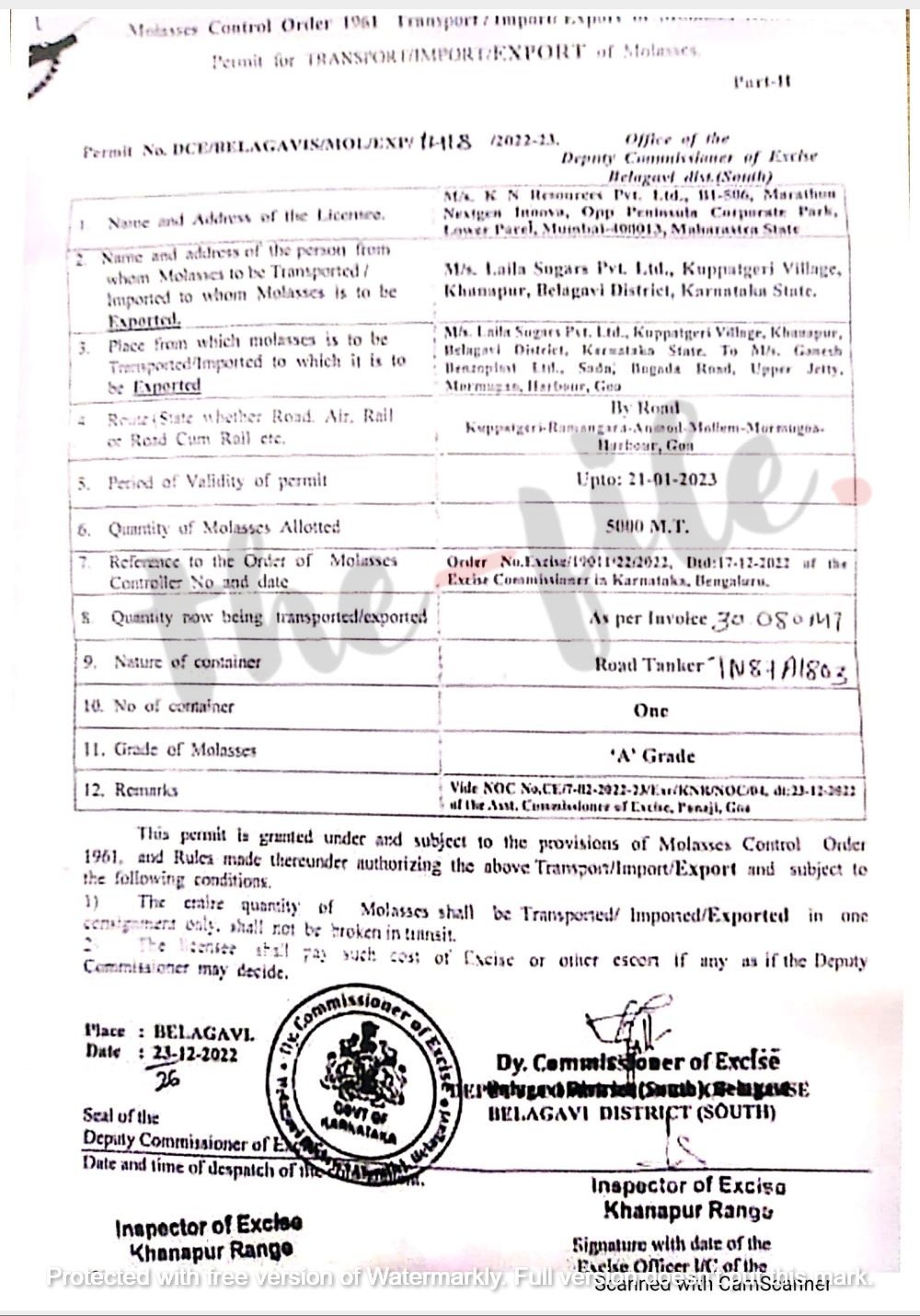 ಕೆ ಎನ್ ರಿಸೋರ್ಸ್ ಕಂಪನಿಯು ಲೈಲಾ ಷುಗರ್ಸ್ನಲ್ಲಿರುವ 5,000 ಮೆಟ್ರಿಕ್ ಟನ್ ಕಾಕಂಬಿಯನ್ನು ರಸ್ತೆ ಮಾರ್ಗದ ಮೂಲಕ 2023ರ ಜನವರಿ 21ರವರೆಗೆ ರಫ್ತು ಮಾಡಲು 2022ರ ಡಿಸೆಂಬರ್ 23ರಂದು ರಹದಾರಿ ಪತ್ರ ನೀಡಿರುವುದು ಗೊತ್ತಾಗಿದೆ.