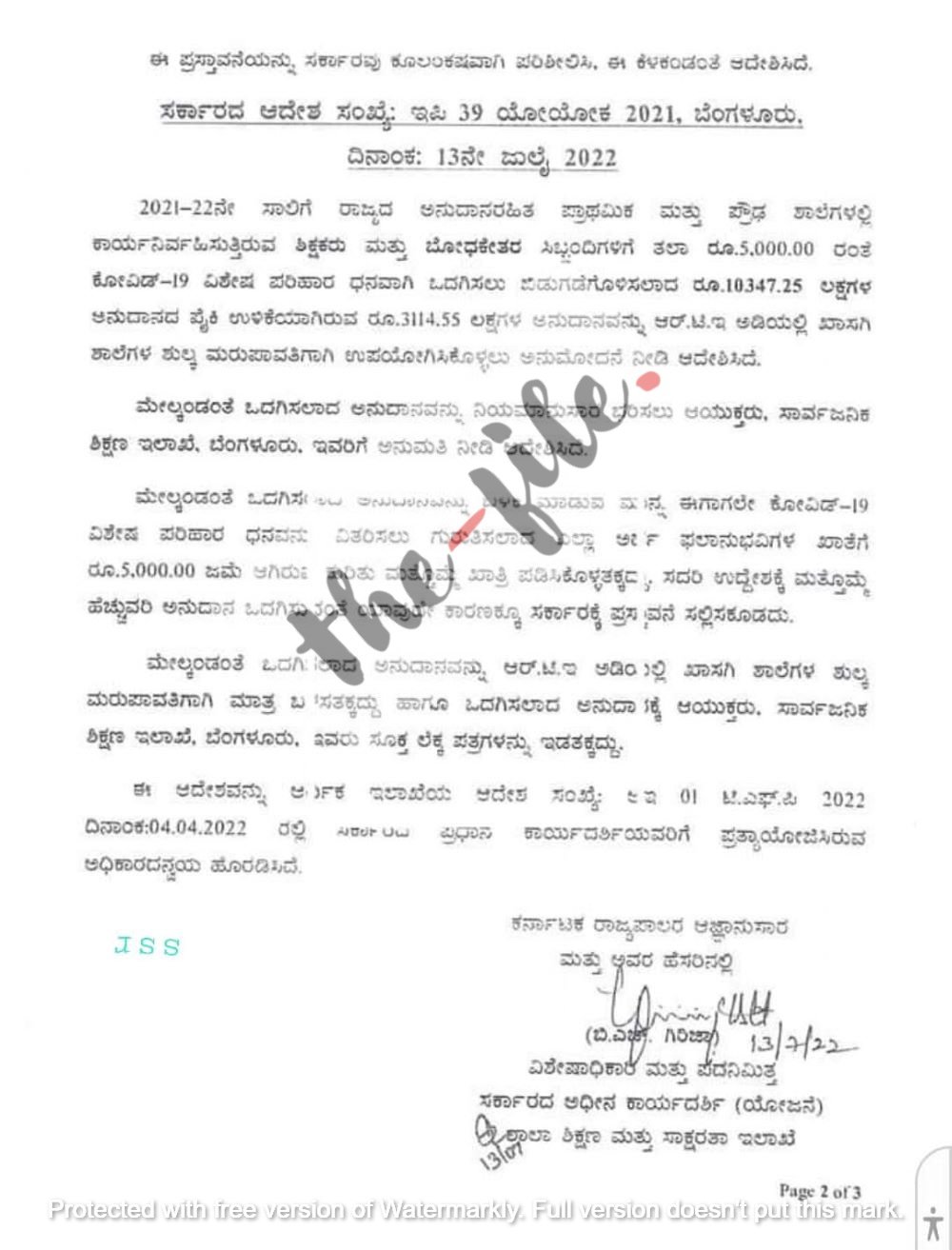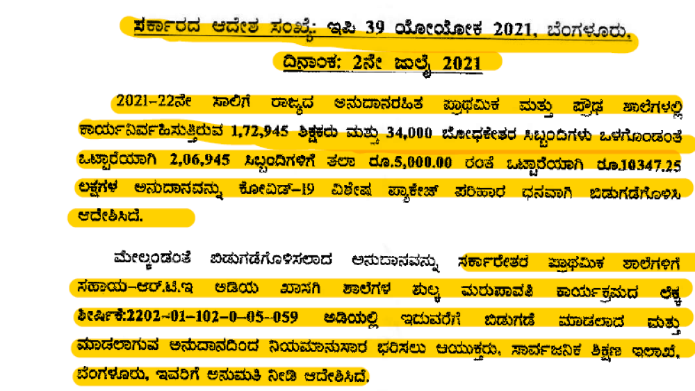 ‘2021-22ನೇ ಸಾಲಿಗೆ ರಾಜ್ಯದ ಅನುದಾನ ರಹಿತ ಪ್ರಾಥಮಿಕ ಮತ್ತು ಪ್ರೌಢಶಾಲೆಗಳಲ್ಲಿ ಕಾರ್ಯನಿರ್ವಹಿಸುತ್ತಿರುವ 1,72,945 ಮತ್ತು 34,000 ಬೋಧಕೇತರ ಸಿಬ್ಬಂದಿ ಒಳಗೊಂಡಂತೆ 2,06,945 ಸಿಬ್ಬಂದಿಗಳಿಗೆ ತಲಾ 5,000 ರು.ನಂತೆ ಒಟ್ಟಾರೆಯಾಗಿ 103.47 ಕೋಟಿ ರು ಅನುದಾನವನ್ನು ಕೋವಿಡ್ 19 ವಿಶೇಷ ಪ್ಯಾಕೇಜ್ ಪರಿಹಾರ ಧನವಾಗಿ ಬಿಡುಗಡೆಗೊಳಿಸಿ,’ ಎಂದು 2021ರ ಜುಲೈ 2ರಂದು ಶಿಕ್ಷಣ ಇಲಾಖೆಯು ಆದೇಶ ಹೊರಡಿಸಿತ್ತು. ಇದಕ್ಕೆ ಆರ್ಥಿಕ ಇಲಾಖೆಯು (ಟಿಪ್ಪಣಿ ಸಂಖ್ಯೆ; ಆಇ 278 ವೆಚ್ಚ-8/2021, 15.06.2021)ರಂದು ಸಹಮತಿ ನೀಡಿತ್ತು.