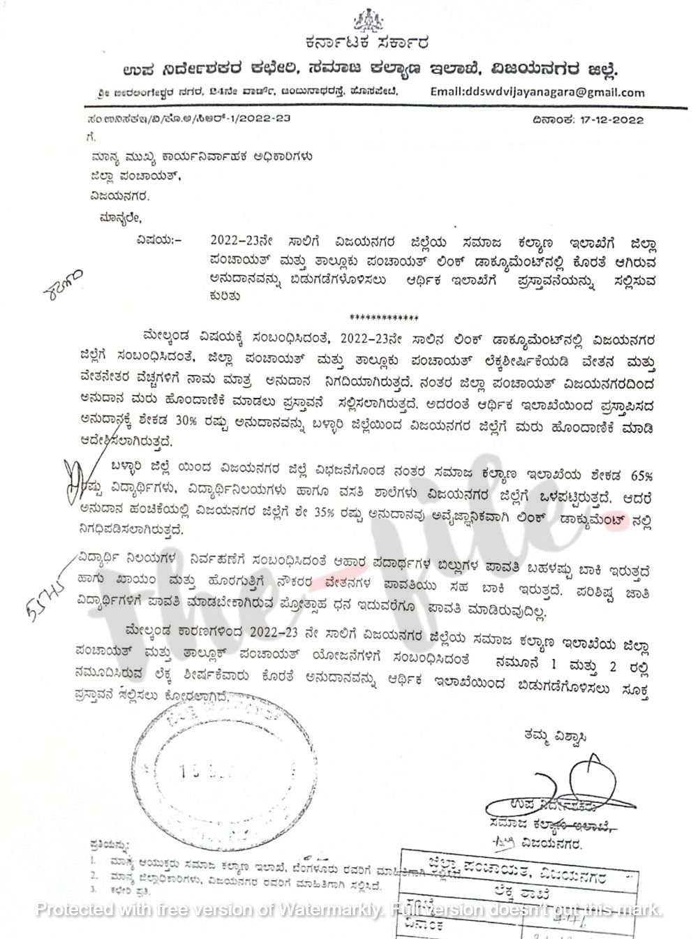 ಈ ಕುರಿತು ವಿಜಯನಗರ ಜಿಲ್ಲೆಯ ಸಮಾಜ ಕಲ್ಯಾಣ ಇಲಾಖೆಯ ಉಪ ನಿರ್ದೇಶಕರು ವಿಜಯನಗರ ಜಿಲ್ಲಾ ಪಂಚಾಯ್ತಿಯ ಮುಖ್ಯ ಕಾರ್ಯನಿರ್ವಾಹಕ ಅಧಿಕಾರಿಗೆ 2022ರ ಡಿಸೆಂಬರ್ 17ರಂದು ಪತ್ರ ಬರೆದಿದ್ದಾರೆ. ಈ ಪತ್ರದ ಪ್ರತಿಯು ‘ದಿ ಫೈಲ್’ಗೆ ಲಭ್ಯವಾಗಿದೆ.