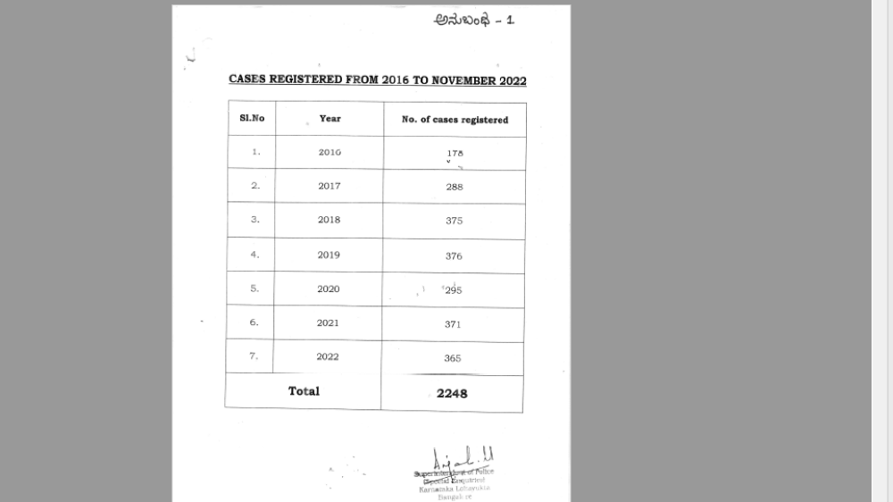 ಕಾಂಗ್ರೆಸ್ ಸರ್ಕಾರದ ಅವಧಿಯ 2016-17ರಿಂದ 2018ರವರೆಗೆ 841 ಪ್ರಕರಣಗಳು ದಾಖಲಾಗಿವೆ. 2019ರಿಂದ 2022ರವರೆಗೆ ಒಟ್ಟು 1,407 ಪ್ರಕರಣಗಳು ದಾಖಲಾಗಿವೆ. ಈ ಪೈಕಿ ಕಳೆದ 2 ವರ್ಷದಲ್ಲೇ 736 ಪ್ರಕರಣಗಳಿವೆ. 2016ರಲ್ಲಿ 178, 2017ರಲ್ಲಿ 288, 2018ರಲ್ಲಿ 375, 2019ರಲ್ಲಿ 376, 2020ರಲ್ಲಿ 295, 2021ರಲ್ಲಿ 371, 2022ರಲ್ಲಿ 365 ಪ್ರಕರಣಗಳು ದಾಖಲಾಗಿವೆ.