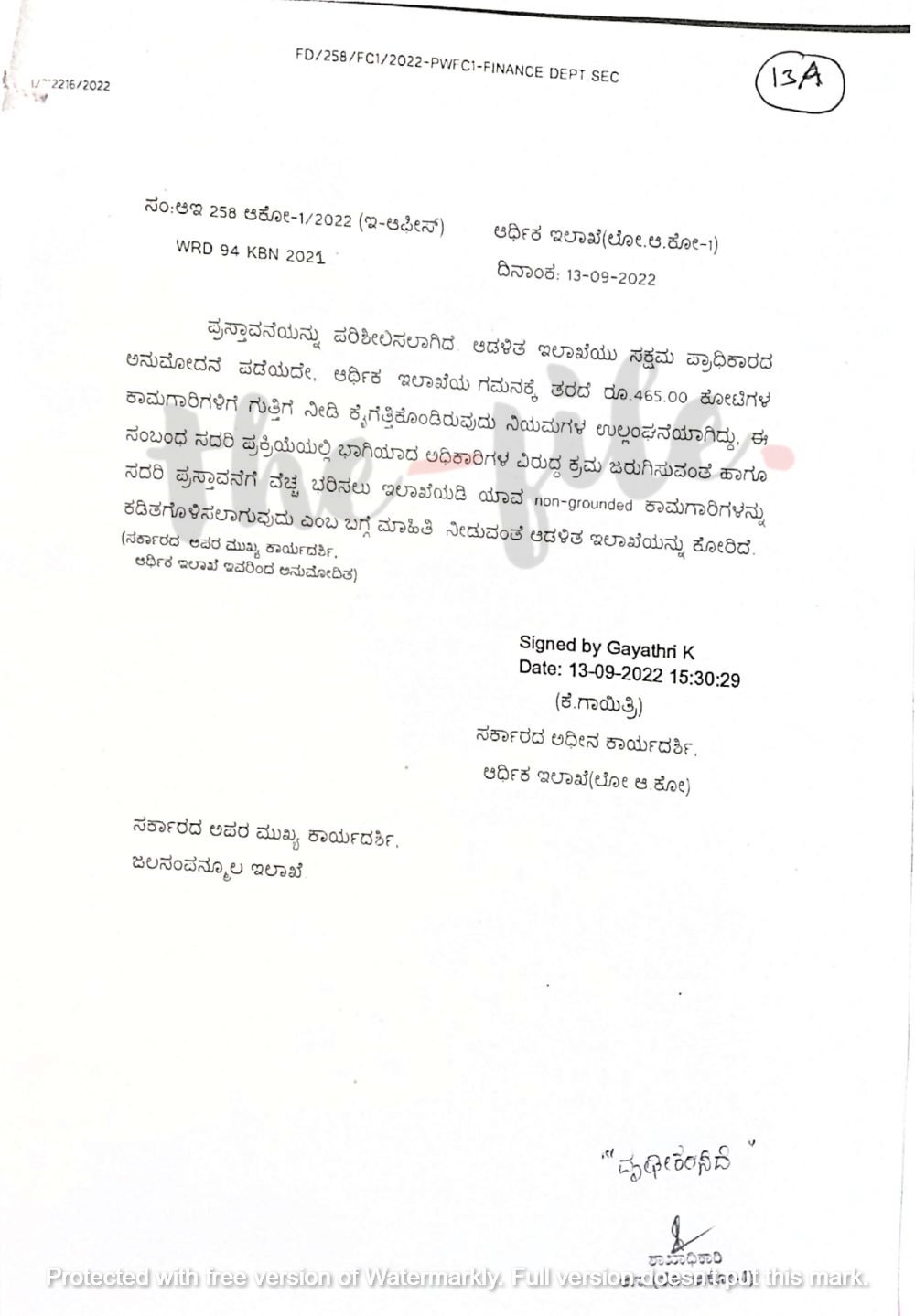 ‘ಪ್ರಸ್ತಾವನೆಯನ್ನು ಪರಿಶೀಲಿಸಲಾಗಿದೆ. (ಸಂ;ಆಇ 258 ಆಕೋ-1/2022, WRD 94 KBN 2021 DATED 13-09-2022) ಅಡಳಿತ ಇಲಾಖೆಯು ಸಕ್ಷಮ ಪ್ರಾಧಿಕಾರದ ಅನುಮೋದನೆ ಪಡೆಯದೇ, ಅರ್ಥಿಕ ಇಲಾಖೆಯ ಗಮನಕ್ಕೂ ತರದೇ ರೂ 465.00 ಕೋಟಿ ರು.ಗಳ ಕಾಮಗಾರಿಗಳಿಗೆ ಗುತ್ತಿಗೆ ನೀಡಿ ಕೈಗೆತ್ತಿಕೊಂಡಿರುವುದು ನಿಯಮಗಳ ಉಲ್ಲಂಘನೆಯಾಗಿದ್ದು ಈ ಸಂಬಂಧ ಸದರಿ ಪ್ರಕ್ರಿಯೆಯಲ್ಲಿ ಭಾಗಿಯಾದ ಅಧಿಕಾರಿಗಳ ವಿರುದ್ಧ ಕ್ರಮ ಜರುಗಿಸುವಂತೆ ಹಾಗೂ ಸದರಿ ಪ್ರಸ್ತಾವನೆಗೆ ವೆಚ್ಚ ಭರಿಸಲು ಇಲಾಖೆಯಡಿ ಯಾವ non-grounded ಕಾಮಗಾರಿಗಳನ್ನು ಕಡಿತಗೊಳಿಸಲಾಗುವುದು ಎಂಬ ಬಗ್ಗೆ ಮಾಹಿತಿ ನೀಡಬೇಕು,’ ಎಂದು ಅರ್ಥಿಕ ಇಲಾಖೆಯ ಸರ್ಕಾರದ ಅಧೀನ ಕಾರ್ಯದರ್ಶಿ ಕೆ ಗಾಯಿತ್ರಿ ಅವರು 2022ರ ಸೆಪ್ಟಂಬರ್ 13ರಂದು ಜಲಸಂಪನ್ಮೂಲ ಇಲಾಖೆಯ ಸರ್ಕಾರದ ಹೆಚ್ಚುವರಿ ಮುಖ್ಯ ಕಾರ್ಯದರ್ಶಿಗೆ ಪತ್ರ ಬರೆದಿದ್ದಾರೆ.
