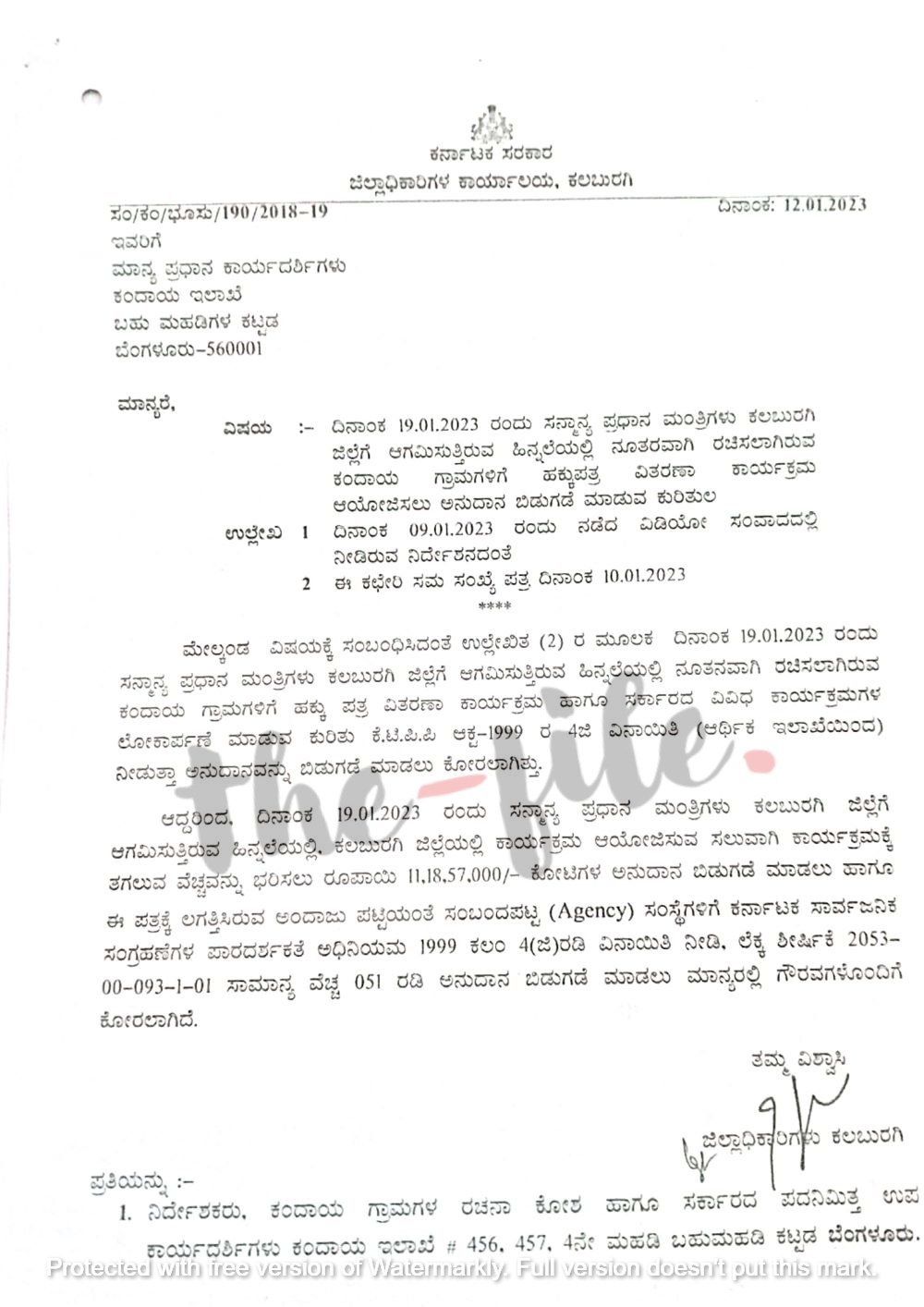 ನೂತನವಾಗಿ ರಚಿಸಿರುವ ಕಂದಾಯ ಗ್ರಾಮಗಳಿಗೆ ಹಕ್ಕುಪತ್ರ ವಿತರಣೆ ಮತ್ತು ಸರ್ಕಾರದ ವಿವಿಧ ಕಾರ್ಯಕ್ರಮಗಳ ಲೋಕಾರ್ಪಣೆ ಮಾಡುವ ಕಾರ್ಯಕ್ರಮಕ್ಕೆ ಕೆಟಿಪಿಪಿ ಕಾಯ್ದೆ 4 (ಜಿ) ವಿನಾಯಿತಿ ಕೋರಿದ್ದ ಕಲ್ಬುರ್ಗಿ ಜಿಲ್ಲಾಧಿಕಾರಿಗಳು ಕಾರ್ಯಕ್ರಮಕ್ಕೆ ಒಟ್ಟಾರೆ 11,18,57,000 ರು.ಗಳ ಅನುದಾನ ಕೋರಿಕೆ ಸಲ್ಲಿಸಿದ್ದರು. ಈ ಸಂಬಂಧ 2023ರ ಜನವರಿ 12ರಂದು ಕಂದಾಯ ಇಲಾಖೆಯ ಸರ್ಕಾರದ ಪ್ರಧಾನ ಕಾರ್ಯದರ್ಶಿಗಳಿಗೆ ಬರೆದಿದ್ದ ಪತ್ರ ಮತ್ತು ಸಲ್ಲಿಸಿದ್ದ ಅಂದಾಜು ಪಟ್ಟಿಯು ‘ದಿ ಫೈಲ್’ಗೆ ಲಭ್ಯವಾಗಿದೆ.