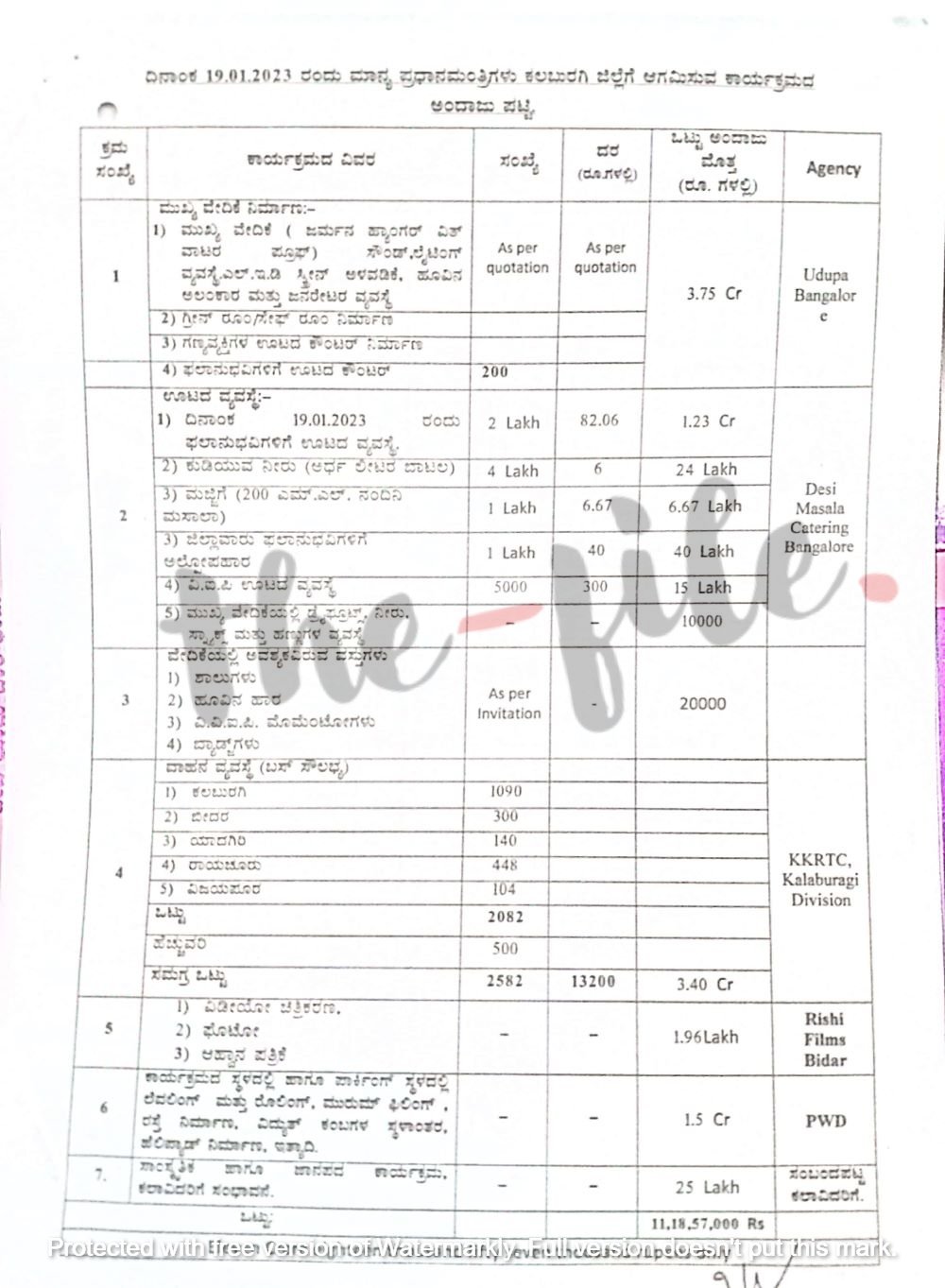 ‘ದಿನಾಂಕ 19.01.2023ರಂದು ಸನ್ಮಾನ್ಯ ಪ್ರಧಾನಮಂತ್ರಿಗಳು ಕಲಬುರಗಿ ಜಿಲ್ಲೆಗೆ ಆಗಮಿಸುತ್ತಿರುವ ಹಿನ್ನೆಲೆಯಲ್ಲಿ ಕಲಬುರಗಿ ಜಿಲ್ಲೆಯಲ್ಲಿ ಕಾರ್ಯಕ್ರಮ ಆಯೋಜಿಸುವ ಸಲುವಾಗಿ ಕಾರ್ಯಕ್ರಮಕ್ಕೆ ತಗುಲುವ ವೆಚ್ಚವನ್ನು ಭರಿಸಲು 11,18,57,000 ಕೋಟಿ ರು.ಗಳ ಅನುದಾನವನ್ನು ಲೆಕ್ಕ ಶೀರ್ಷಿಕೆ 2053-00-093-1-01 ಸಾಮಾನ್ಯ ವೆಚ್ಚ 051ರಡಿ ಬಿಡುಗಡೆ ಮಾಡಬೇಕು,’ ಎಂದು ಕಲ್ಬುರ್ಗಿ ಜಿಲ್ಲಾಧಿಕಾರಿಗಳು ಅಂದಾಜು ಪಟ್ಟಿಯನ್ನೂ ಸಲ್ಲಿಸಿದ್ದರು.