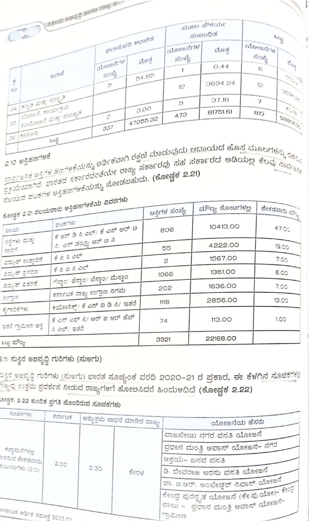 ಕೇಂದ್ರ ಪುರಸ್ಕೃತ ಮತ್ತು ರಾಜ್ಯ ವಲಯ ಯೋಜನೆಗಳ ವ್ಯಾಪ್ತಿಯಲ್ಲಿ ಕಚ್ಛಾ ಮನೆಗಳು, ಬೆಳವಣಿಗೆ ಕುಂಠಿತವಾಗಿರುವುದು ಮತ್ತು ತೂಕ ಕಡಿಮೆ ಇರುವ ಮಕ್ಕಳು, ಗರ್ಭಿಣಿಯರಲ್ಲಿ ರಕ್ತಹೀನತ ಹೊಂದಿರುವುದು, ತಾಯಂದಿರ ಮರಣ ಪ್ರಮಾಣ ಕನಿಷ್ಠ ಮಾಧ್ಯಮಿಕ ಶಿಕ್ಷಣ, ಪುರುಷ ಕಾರ್ಮಿಕರ ಭಾಗವಹಿಸುವಿಕೆಯ ದರಕ್ಕೆ ಮಹಿಳಾ ಕಾರ್ಮಿಕ ಶಕ್ತಿಯ ಭಾಗವಹಿಸುವಿಕೆ ದರ, ಮಹಿಳಾ ಜನಸಂಖ್ಯೆಗೆ ಅನುಗುಣವಾಗಿ ಮಹಿಳೆಯರ ಮೇಲಿನ ಅಪರಾಧಗಳ ಪ್ರಮಾಣ, ಕೊಳವೆ ನೀರು ಸರಬರಾಜಿನ ಮೂಲಕ ಸುರಕ್ಷಿತ ಮತ್ತು ಸಮರ್ಪಕ ಕುಡಿಯುವ ನೀರು ಪಡೆಯುವುದು, ನಿರುದ್ಯೋಗ ಪ್ರಮಾಣ, ಕಾರ್ಮಿಕ ಬಲದ ಭಾಗವಹಿಸುವಿಕೆ, ಪ್ರತಿ ಲಕ್ಷ ಜನಸಂಖ್ಯೆಗೆ ಪರಿಶಿಷ್ಟ ಪಂಗಡ ಮತ್ತು ಜಾತಿಗಳ ವಿರುದ್ಧದ ಅಪರಾಧಗಳು, ಒಳಚರಂಡಿ ಸೇರಿದಂತೆ 46 ವಲಯಗಳಲ್ಲಿ ದೇಶದ ಹಲವು ರಾಜ್ಯಗಳಿಗೆ ಹೋಲಿಸಿದರೆ ಕರ್ನಾಟಕವು ಸುಸ್ಥಿರ ಅಭಿವೃದ್ಧಿ ಗುರಿ ಮುಟ್ಟುವಲ್ಲಿ ಹಿಂದುಳಿದಿದೆ ಎಂಬ ಸಂಗತಿಯು ಆರ್ಥಿಕ ಸಮೀಕ್ಷೆಯಿಂದ ತಿಳಿದು ಬಂದಿದೆ.