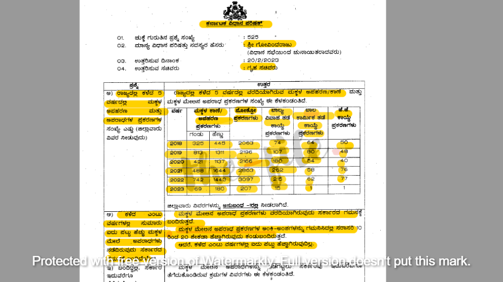 ಬಿಜೆಪಿ ಸರ್ಕಾರದ ಅವಧಿಯಲ್ಲಿ 4,242 ಮಕ್ಕಳ ಅಪಹರಣ/ಕಾಣೆಯಾಗಿರುವ ಪ್ರಕರಣಗಳು ವರದಿಯಾಗಿವೆ. ಇದೇ ಅವಧಿಯಲ್ಲಿ 12,592 ಪೋಕ್ಸೋ ದಾಖಲಾಗಿವೆ. 853 ಬಾಲ್ಯ ವಿವಾಹ ತಡೆ ಕಾಯ್ದೆ ಅಡಿ ಪ್ರಕರಣ ದಾಖಲಾಗಿವೆ. 319 ಬಾಲಕಾರ್ಮಿಕ ತಡೆ ಕಾಯ್ದೆ ಪ್ರಕರಣಗಳು ದಾಖಲಾಗಿವೆ. ಜೆಜೆ ಕಾಯ್ದೆ ಅಡಿ 292 ಪ್ರಕರಣಗಳು ದಾಖಲಾಗಿವೆ