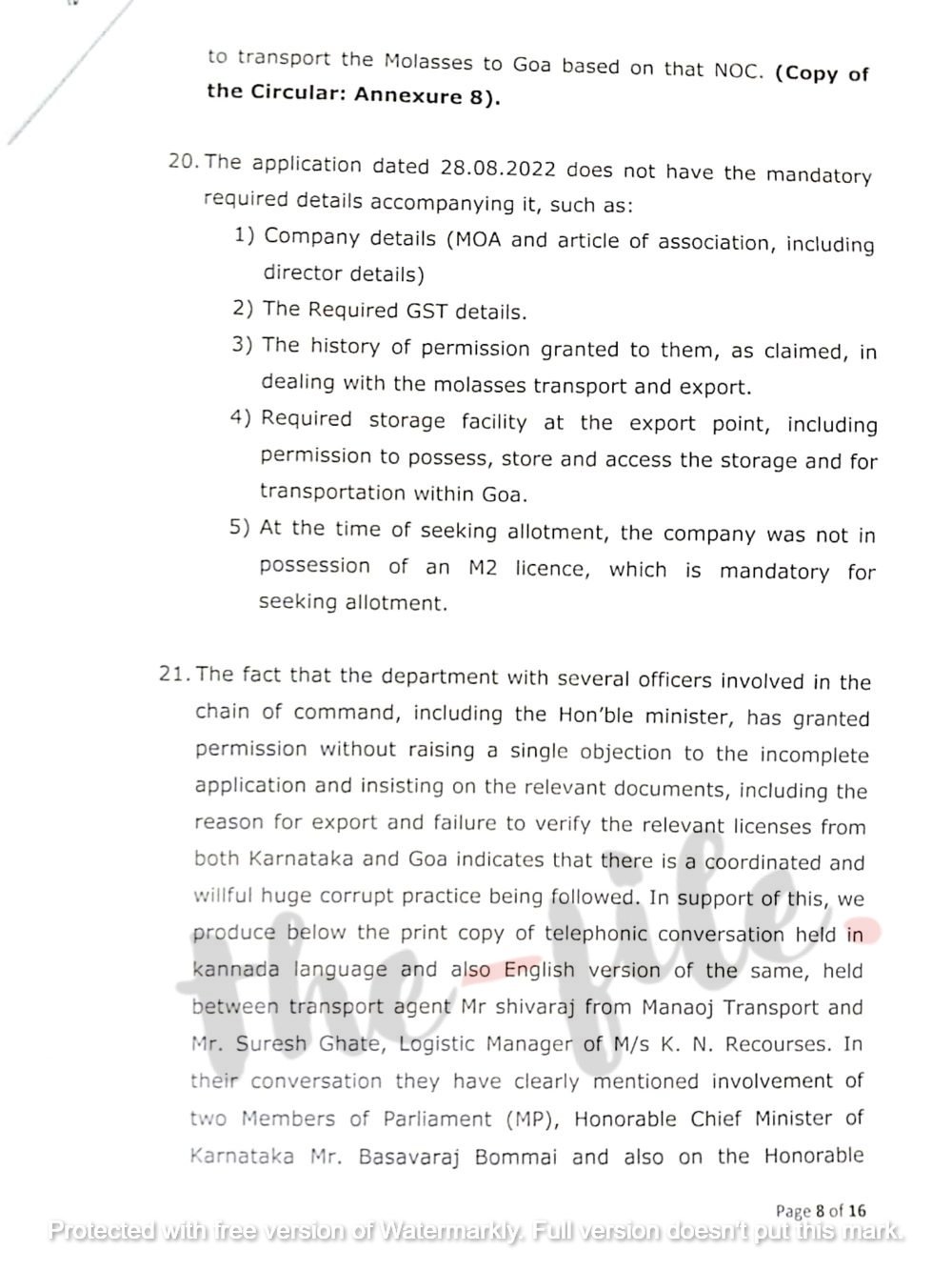 ಆದರೆ ಈ ಪತ್ರದ ಜತೆಗೆ ಸಲ್ಲಿಸಬೇಕಾಗಿದ್ದ ಯಾವುದೇ ಸಂಬಂಧಿತ ದಾಖಲೆಗಳನ್ನು ಲಗತ್ತಿಸಿಲ್ಲ. ಕಂಪೊನಿಯು ಈಗಾಗಲೇ ಗೋವಾ ರಾಜ್ಯ ಅಬಕಾರಿ ಅಧಿಕಾರಿಗಳಿಗೆ ಕಾಕಂಬಿ ಸ್ವಾಧೀನ ಮತ್ತು ರಫ್ತು ಪರವಾನಿಗೆಗಾಗಿ ಅರ್ಜಿ ಸಲ್ಲಿಸಿದೆ ಎಂದಷ್ಟೇ ಹೇಳಲಾಗಿದೆ. ಆದರೆ ಪತ್ರದ ಜತೆಗೆ ಇವುಗಳ ವಿವರಗಳನ್ನು ಲಗತ್ತಿಸಿಲ್ಲ ಎಂದು ಲಂಚಮುಕ್ತ ಕರ್ನಾಟಕ ವೇದಿಕೆಯು ದೂರಿನಲ್ಲಿ ವಿವರಿಸಿರುವುದು ಗೊತ್ತಾಗಿದೆ.
