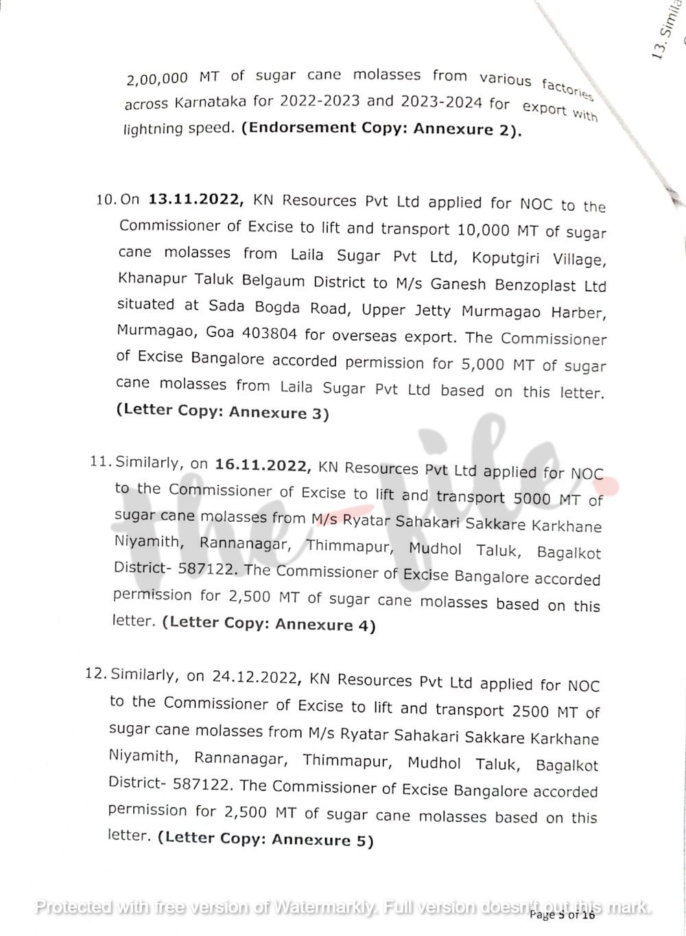 ಅದರಂತೆ ಈ ಕಂಪನಿಯು 2022ರ ನವೆಂಬರ್ 13ರಂದು ಕಾಕಂಬಿಯನ್ನು ಎತ್ತುವಳಿ ಮತ್ತು ಸಾಗಾಣಿಕೆ ಮಾಡಲು ಎನ್ಒಸಿಗೆ ಅಬಕಾರಿ ಆಯುಕ್ತರಿಗೆ ಅರ್ಜಿ ಸಲ್ಲಿಸಿತ್ತು. ಈ ಪೈಕಿ ಲೈಲಾ ಶುಗರ್ ಪ್ರೈವೈಟ್ ಲಿಮಿಟೆಡ್ನಿಂದ 5,000 ಮೆಟ್ರಿಕ್ ಟನ್ ಮತ್ತು ಬಾಗಲಕೋಟೆಯ ರನ್ನ ನಗರದಲ್ಲಿರುವ ರೈತರ ಸಹಕಾರಿ ಸಕ್ಕರೆ ಕಾರ್ಖಾನೆಯಿಂದ 7,500 ಮೆಟ್ರಿಕ್ ಟನ್ ಕಾಕಂಬಿ ರಫ್ತು ಮಾಡಲು ನವೆಂಬರ್ 16 ಮತ್ತು ಡಿಸೆಂಬರ್ 24ರಂದು ಕೋರಿತ್ತು.