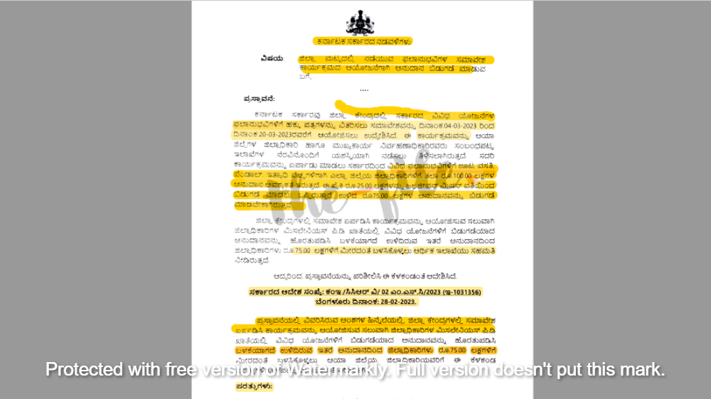 ಜಿಲ್ಲಾ ಮಟ್ಟದಲ್ಲಿ ನಡೆಯುವ ಫಲಾನುಭವಿಗಳ ಸಮಾವೇಶ ಕಾರ್ಯಕ್ರಮದ ಆಯೋಜನೆಗೆ ಅನುದಾನ ಬಿಡುಗಡೆ ಸಂಬಂಧ ಕಂದಾಯ ಗ್ರಾಮಗಳ ರಚನಾ ಕೋಶದ ನಿರ್ದೇಶಕರು 2023ರ ಫೆ.28ರಂದು ಆದೇಶ ಹೊರಡಿಸಿದ್ದಾರೆ. ಈ ಆದೇಶದ ಪ್ರತಿಯು ‘ದಿ ಫೈಲ್‌’ಗೆ ಲಭ್ಯವಾಗಿದೆ.