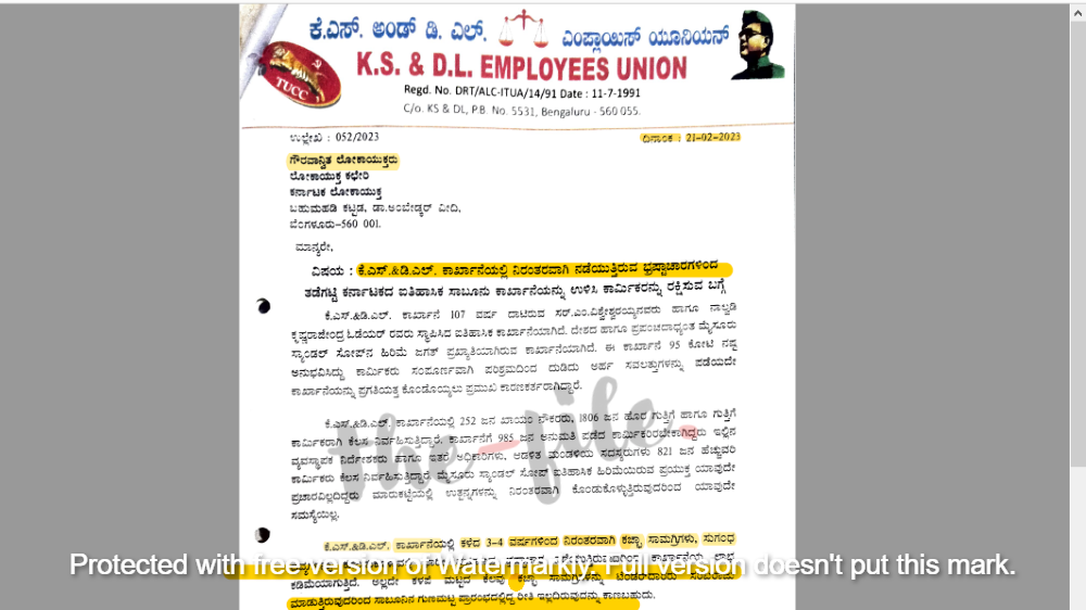 ಕೆಎಸ್‌ಡಿಎಲ್‌ ಕಾರ್ಖಾನೆಯು ಖರೀದಿಸುವ ಕಚ್ಛಾ ಸಾಮಗ್ರಿಗಳಲ್ಲಿರುವ ನ್ಯೂನತೆಗಳ ಬಗ್ಗೆ ಪರಿಶೀಲಿಸಿ ಕಾನೂನಿನ ಚೌಕಟ್ಟಿನಲ್ಲಿ ಕ್ರಮವಹಿಸಲು ಇಲಾಖೆ ಸಮಿತಿಗಳನ್ನು ರಚಿಸಬೇಕು ಎಂದು ಆರ್ಥಿಕ ಇಲಾಖೆಯು 2022ರ ಜನವರಿ 29ರಂದು ಸುತ್ತೋಲೆ ಹೊರಡಿಸಿದ್ದರೂ ಕೆಎಸ್‌ಡಿಎಲ್‌ ಉದ್ದೇಶಪೂರ್ವಕವಾಗಿ ರಚಿಸಿಲ್ಲ ಎಂದು ನೌಕರರ ಸಂಘವು ದೂರಿನಲ್ಲಿ ಆಪಾದಿಸಿದೆ.
