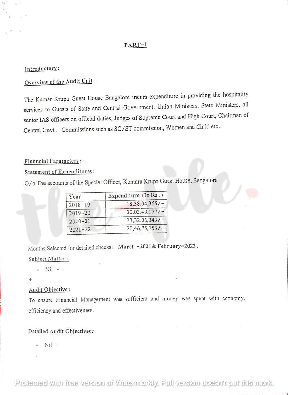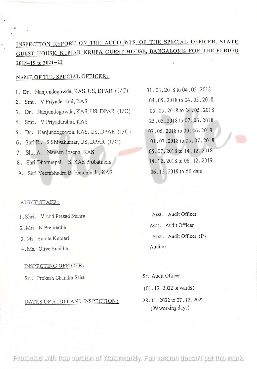 ಅದೇ ರೀತಿ ಕುಮಾರಕೃಪ ಅತಿಥಿ ಗೃಹಕ್ಕೆ ಸಂಬಂಧಿಸಿದಂತೆ ಮಾರ್ಚ್ 2021 ಮತ್ತು ಏಪ್ರಿಲ್ 2022ರಲ್ಲಿ ನಡೆದಿರುವ ಹಣಕಾಸಿನ ವಹಿವಾಟುಗಳಿಗೆ ಸಂಬಂಧಿಸಿದ ನಗದು ವಹಿಗಳಲ್ಲಿ ವ್ಯತ್ಯಾಸ ಕಂಡು ಬಂದಿದೆ. ಮಾರ್ಚ್ 2021ರಲ್ಲಿ 67 ಬಿಲ್, ಫೆಬ್ರುವರಿ 2022ರಲ್ಲಿ 81 ಬಿಲ್ಗಳಿಗೆ ಸಂಬಂಧಿಸಿದ ಒಟ್ಟು 7,53,42,714 ರು. ನಗದು ವಹಿಯಲ್ಲಿ ವ್ಯತ್ಯಾಸ ಕಂಡುಬಂದಿರುವುದು ತಪಾಸಣೆ ವರದಿಯಿಂದ ಗೊತ್ತಾಗಿದೆ.