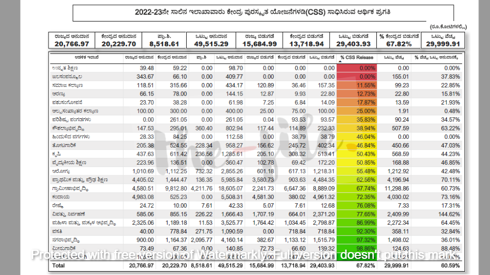 ಯೋಜನಾ ಇಲಾಖೆಯು 2022-23ನೇ ಸಾಲಿನ ಪ್ರಮುಖ ಕಾರ್ಯಕ್ರಮಗಳ ಕುರಿತು ಕೆಡಿಪಿ ಸಭೆಗೆ ಒದಗಿಸಿರುವ ಅಂಕಿ ಅಂಶಗಳ ಸಮಗ್ರ ಮಾಹಿತಿಯಲ್ಲಿ ಕೇಂದ್ರ ಪುರಸ್ಕೃತ ಯೋಜನೆಗಳ ಆರ್ಥಿಕ ಪ್ರಗತಿಯ ಕುರಿತೂ ವಿವರಗಳಿವೆ. ಈ ಮಾಹಿತಿಯು ‘ದಿ ಫೈಲ್’ ಗೆ ಲಭ್ಯವಾಗಿದೆ.
