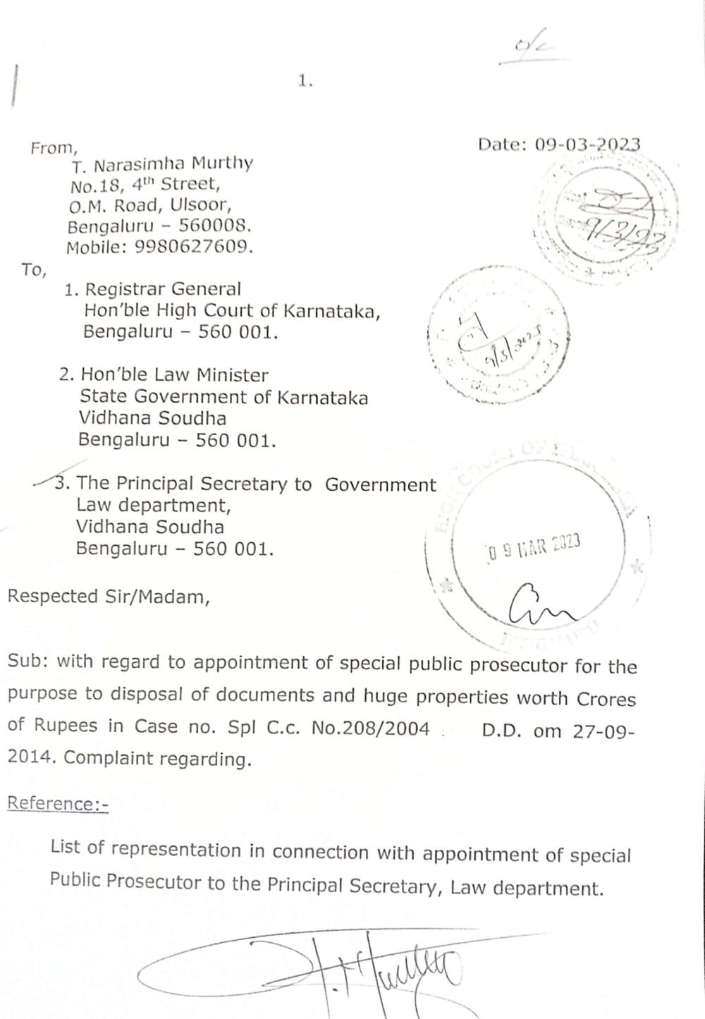 ವಿಶೇಷ ಸರ್ಕಾರಿ ಅಭಿಯೋಜಕರ ನೇಮಕ ಮಾಡುವ ಸಂಬಂಧ 2021ರಲ್ಲೇ ಸೆಷನ್ಸ್ ನ್ಯಾಯಾಧೀಶರು ಸರ್ಕಾರಕ್ಕೆ ನಿರ್ದೇಶನ ನೀಡಿದ್ದರು. ಈ ನಿರ್ದೇಶನವನ್ನು ಸರ್ಕಾರವು ಪಾಲಿಸದ ಕಾರಣ ಮಾಹಿತಿ ಹಕ್ಕು ಕಾರ್ಯಕರ್ತ ಟಿ ನರಸಿಂಹಮೂರ್ತಿ ಅವರು ರಾಜ್ಯ ಸರ್ಕಾರದ ಕಾನೂನು ಇಲಾಖೆಯ ಪ್ರಧಾನ ಕಾರ್ಯದರ್ಶಿಗೆ ಹಲವು ಬಾರಿ ಪತ್ರ ಬರೆದು ಗಮನಸೆಳೆದಿದ್ದರು. ಆದರೂ ಕಾನೂನು ಇಲಾಖೆಯು ಈ ಬಗ್ಗೆ ಗಮನಹರಿಸದ ಕಾರಣ 2023ರ ಮಾರ್ಚ್ 9ರಂದು ಮತ್ತೊಂದು ಪತ್ರವನ್ನು ಬರೆದಿದ್ದಾರೆ. ಈ ಪತ್ರದ ಪ್ರತಿಯು ‘ದಿ ಫೈಲ್’ಗೆ ಲಭ್ಯವಾಗಿದೆ.