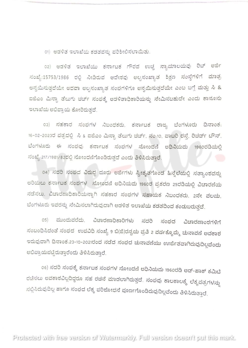 ‘ಆಡಳಿತ ಇಲಾಖೆಯು ಕರ್ನಾಟಕ ಹೈಕೋರ್ಟ್ ರಿಟ್ ಅರ್ಜಿ ಸಂಖ್ಯೆ 15753/1983ರಲ್ಲಿ ನೀಡಿರುವ ಆದೇಶವು ಅಲ್ಪಸಂಖ್ಯಾತ ಶಿಕ್ಷಣ ಸಂಸ್ಥೆಗಳಿಗೆ ಮಾತ್ರ ಅನ್ವಯಿಸುತ್ತದೆಯೇ ಅಥವಾ ಅಲ್ಪಸಂಖ್ಯಾತ ಸಂಘಗಳಿಗೂ ಅನ್ವಯಿಸುತ್ತದೇ ಎಂಬ ಬಗ್ಗೆ ಮತ್ತು ಸಿ ಅಂಡ್ ಐಜಿಎಂ ಮಿಸ್ಪಾ ತೆಲುಗು ಚರ್ಚ್ ಸಂಘಕ್ಕೆ ಆಡಳಿತಾಧಿಕಾರಿಯನ್ನು ನೇಮಿಸಬಹುದೇ,’ ಎಂದು ಸಹಕಾರ ಇಲಾಖೆಯು ಕಾನೂನು ಇಲಾಖೆಗೆ ಅಭಿಪ್ರಾಯ ಕೋರಿ ಕಡತ ಮಂಡಿಸಿತ್ತು.