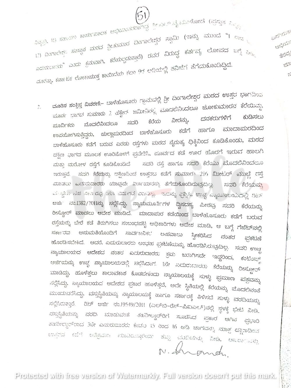 ಈ ರೀತಿಯಾಗಿ ದಾಖಲೆಯಲ್ಲಿದ್ದ ಆಸ್ತಿಯನ್ನು ತೆಗೆದುಹಾಕುವುದು, ಮಠದ ಹೆಸರಿನಲ್ಲಿ ಆಸ್ತಿಯನ್ನು ವರ್ಗಾಯಿಸಿದಂತೆ ಆಗುತ್ತದೆ. ಅಂತಹ ಆಸ್ತಿ ವರ್ಗಾವಣೆಯನ್ನು ಕೇವಲ ಸಿವಿಲ್ ನ್ಯಾಯಾಲಯದ ಆದೇಶದನ್ವಯ ಮಾತ್ರ ಮಾರ್ಪಡಿಸಲು ಅವಕಾಶವಿದೆಯೆ ಹೊರತು ಗ್ರಾಮ ಸಭೆಯ ಠರಾವಿನ ಮೂಲಕ ಈ ಹಕ್ಕನ್ನು ಮಠದ ಹೆಸರಿಗೆ ವರ್ಗಾಯಿಸಲು ಅಥವಾ ತಿದ್ದುಪಡಿ ಮಾಡಲು ಗ್ರಾಮ ಪಂಚಾಯತ್ಗೆ ಯಾವುದೇ ಹಕ್ಕುಕ ಇಲ್ಲ. ಈ ರೀತಿ ಖಾತೆ ಬದಲಾವಣೆ ಮಾಡಿರುವುದು ಕಾನೂನುಬಾಹಿರವಾಗಿದೆ. ಅದೇ ರೀತಿ ಲಭ್ಯವಿರುವ ದಾಖಲೆಗಳನ್ನು ಪರಿಶೀಲಿಸಲಾಗಿದ್ದು ಎದುರುದಾರರು ಕರ್ನಾಟಕ ಉಚ್ಛ ನ್ಯಾಯಾಲಯದ ರಿಟ್ ಅರ್ಜಿ ಸಂಖ್ಯೆ 19549/2011 ಮತ್ತು ಸಿಸಿಸಿ ಸಂ 2264/2011ರ ಅದೇಶಗಳಲ್ಲಿ ನೀಡಿದ್ದ ನಿರ್ದೇಶನವನ್ನೂ ಪಾಲಿಸಿಲ್ಲ.