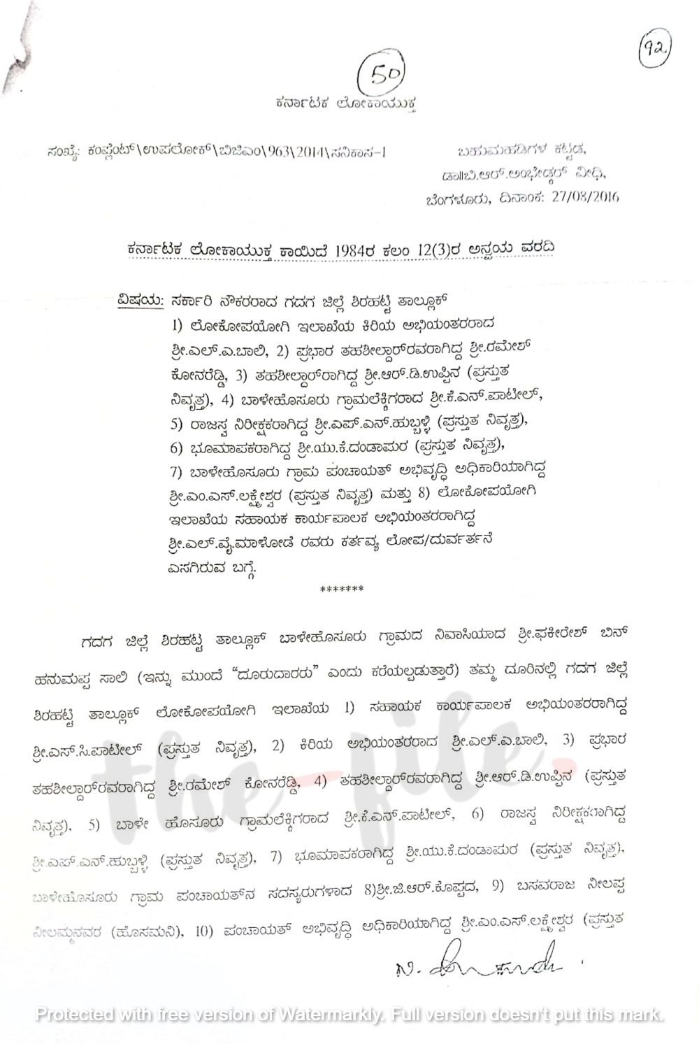 ಈ ಪ್ರಕರಣದಲ್ಲಿ ಶಿರಹಟ್ಟಿ ತಾಲೂಕು ಪಿಡಬ್ಲ್ಯೂಡಿ ಜ್ಯೂನಿಯರ್ ಎಂಜಿನಿಯರ್ ಎಲ್ ಎ ಬಾಲಿ, ಪ್ರಭಾರ ತಹಶೀಲ್ದಾರ್ ಆಗಿದ್ದ ರಮೇಶ್ ಕೋನರೆಡ್ಡಿ (ಹಾಲಿ ಮುಖ್ಯಮಂತ್ರಿಗಳ ಉಪ ಕಾರ್ಯದರ್ಶಿ), ತಹಶೀಲ್ದಾರ್ ಆರ್ ಡಿ ಉಪ್ಪಿನ, ಬಾಳೆಹೊಸೂರು ಗ್ರಾಮ ಲೆಕ್ಕಿಗ ಕೆ ಎನ್ ಪಾಟೀಲ್, ರಾಜಸ್ವ ನಿರೀಕ್ಷಕ ಎಫ್ ಎನ್ ಹುಬ್ಬಳ್ಳಿ, ಭೂಮಾಪಕ ಯು ಕೆ ದಂಡಾಪುರ, ಪಿಡಿಒ ಎಂ ಎಸ್ ಲಕ್ಷ್ಮೇಶ್ವರ, ಪಿಡಬ್ಲ್ಯೂಡಿ ಎಇಇ ಎಲ್ ವೈ ಮಾಳೋಡೆ ಅವರ ವಿರುದ್ಧ ಕರ್ತವ್ಯಲೋಪ/ದುರ್ವರ್ತನೆ ಎಸಗಿದ್ದರು ಎಂದು ಆರೋಪಿಸಲಾಗಿತ್ತು.