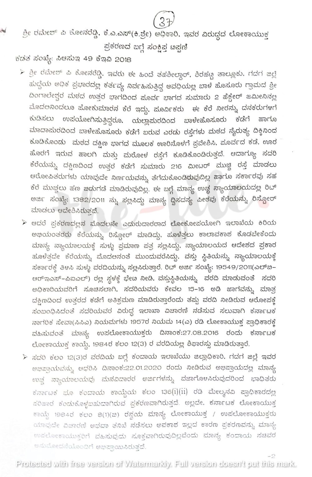 ಈ ಸಂಬಂಧ ಹಿಂದಿನ ತಹಶೀಲ್ದಾರ್ ರಮೇಶ್ ಪಿ ಕೋನರೆಡ್ಡಿ ಸೇರಿದಂತೆ ಇತರ ಎದುರುದಾರರು ತಮ್ಮ ವಿರುದ್ಧದ ನಡವಳಿಯನ್ನು ಕೈಬಿಡಲು ಸೂಕ್ತ, ಸಮಂಜಸ, ಸಮಾಧಾನಕರ ಕಾಋಣ ತೋರಿಸಿಲ್ಲ ಎಂದು ಉಪಲೋಕಾಯುಕ್ತರು ಅಭಿಪ್ರಾಯಿಸಿದ್ದರು. ಕಡತದಲ್ಲಿರುವ ಸಂಗತಿಗಳು ಮತ್ತು ದಾಖಲಾತಿಗಳಿಂದ ಎರಡನೇ ಎದುರುದಾರ ರಮೇಶ್ ಪಿ ಕೋನರೆಡ್ಡಿ ಸೇರಿದಂತೆ 7, 10, 11ನೇ ಎದರುದಾರರು ಸರ್ಕಾರಿ/ಸಾರ್ವಜನಿಕ ನೌಕರರಾಗಿ ಪರಿಪೂರ್ಣ ಪ್ರಾಮಾಣಿಕತೆ, ಸಂಪೂರ್ಣ ಕರ್ತವ್ಯ ನಿಷ್ಠತೆ ಮತ್ತು ಸರ್ಕಾರಿ ಸೇವಕರಿಗೆ ತರವಲ್ಲದ ರೀತಿಯಲ್ಲಿ ನಡೆದುಕೊಂಡ ದುವರ್ತನೆ, ದುರ್ನಡತೆ ಮೇಲ್ನೋಟಕ್ಕೆ ಕಂಡು ಬರುತ್ತದೆ ಎಂದು ವರದಿಯಲ್ಲಿ ಅಭಿಪ್ರಾಯಿಸಿದ್ದರು.