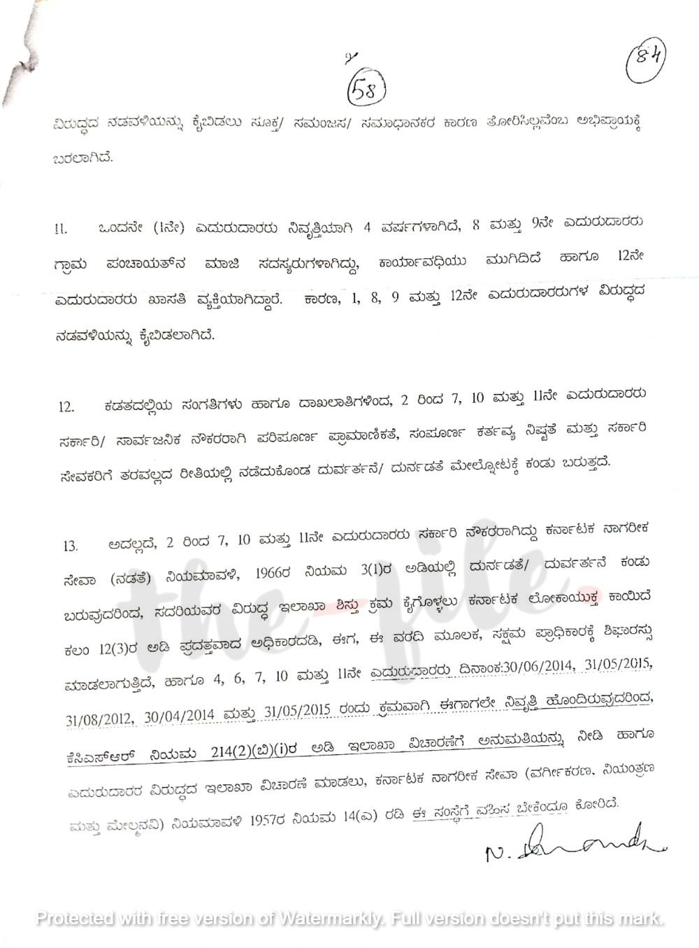 ಹೀಗಾಗಿ ಇವರ ವಿರುದ್ಧ ಇಲಾಖಾ ಶಿಸ್ತು ಕ್ರಮಕೈಗೊಳ್ಳಲು ಕರ್ನಾಟಕ ಲೋಕಾಯುಕ್ತ ಕಾಯಿದೆ ಕಲಂ 12(3) ಅಡಿ ಅಧಿಕಾರದಡಿಯಲ್ಲಿ ಕೆಸಿಎಸ್ಆರ್ ಇಯಮ 214(2)ಬಿ (i)ಅಡಿ ಇಲಾಖೆ ವಿಚಾರಣೆಗೆ ಅನುಮತಿ ನೀಡಿ ಲೋಕಾಯುಕ್ತ ಸಂಸ್ಥೆಗೆ ವಹಿಸಬೇಕು ಎಂದು ಉಪ ಲೋಕಾಯುಕ್ತ ನ್ಯಾಯಮೂರ್ತಿ ಎನ್ ಆನಂದ ಅವರು ರಾಜ್ಯ ಸರ್ಕಾರಕ್ಕೆ ಶಿಫಾರಸ್ಸು ಮಾಡಿದ್ದರು.