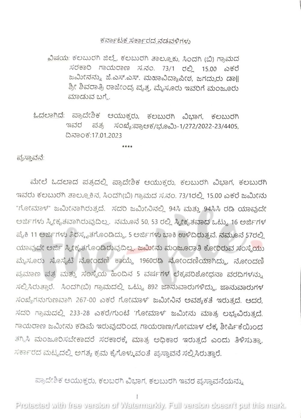 ಕಲ್ಬುರ್ಗಿ ತಾಲೂಕಿನ ಸಿಂದಗಿ (ಬಿ) ಗ್ರಾಮದ ಸರ್ವೆನಂಬರ್ 73/1ರಲ್ಲಿನ 15.00 ಎಕರೆ ಗೋಮಾಳ ಜಮೀನನ್ನು ಜೆ ಎಸ್ ಎಸ್ ಮಹಾವಿದ್ಯಾಪೀಠಕ್ಕೆ ಮಂಜೂರು ಮಾಡುವ ಸಂಬಂಧ ಕಲ್ಬುರ್ಗಿ ವಿಭಾಗದ ಪ್ರಾದೇಶಿಕ ಅಯುಕ್ತರು ಸರ್ಕಾರಕ್ಕೆ ಪ್ರಸ್ತಾವನೆ ಸಲ್ಲಿಸಿದ್ದರು. ಈ ಪ್ರಸ್ತಾವನೆಯನ್ನು ಪುರಸ್ಕರಿಸಿರುವ ಸರ್ಕಾರವು 2023ರ ಮಾರ್ಚ್ 27ರಂದು ಮಂಜೂರು ಮಾಡಿ ಆದೇಶ ಹೊರಡಿಸಿದೆ. ವಿಶೇಷವೆಂದರೇ ಕಲ್ಬುರ್ಗಿ ತಾಲೂಕಿನ ಸಿಂದಗಿ (ಬಿ) ಗ್ರಾಮದಲ್ಲಿ ಗಾಯರಾಣ ಜಮೀನು ಕಡಿಮೆ ಇದೆ.