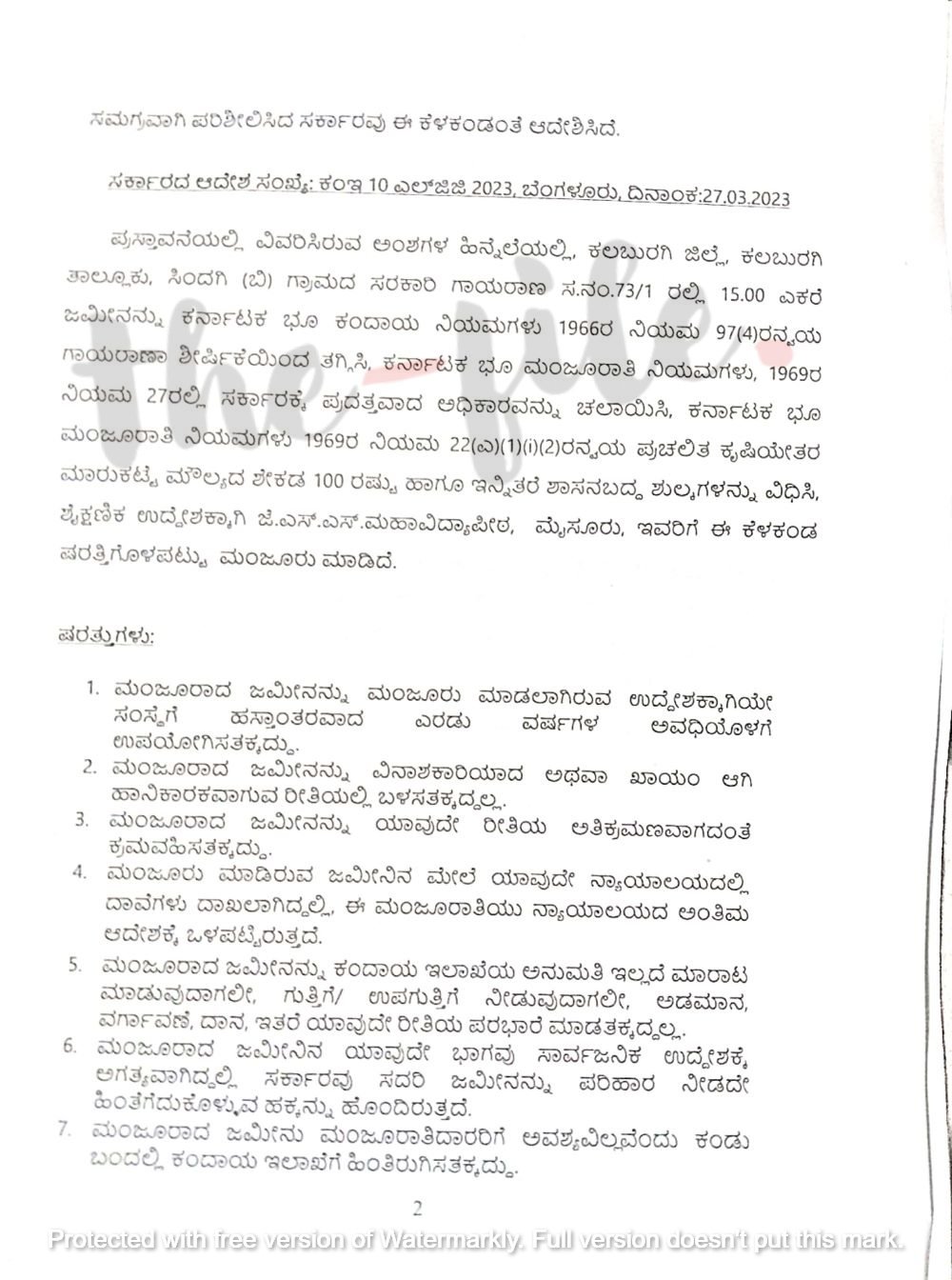 ಜೆಎಸ್ಎಸ್ ಮಹಾವಿದ್ಯಾಪೀಠಕ್ಕೆ 15 ಎಕರೆ ಮಂಜೂರು ಮಾಡಿ 2023ರ ಮಾರ್ಚ್ 27ರಂದು ಹೊರಡಿಸಿರುವ ಆದೇಶದ ಪ್ರತಿಯು ‘ದಿ ಫೈಲ್’ಗೆ ಲಭ್ಯವಾಗಿದೆ.