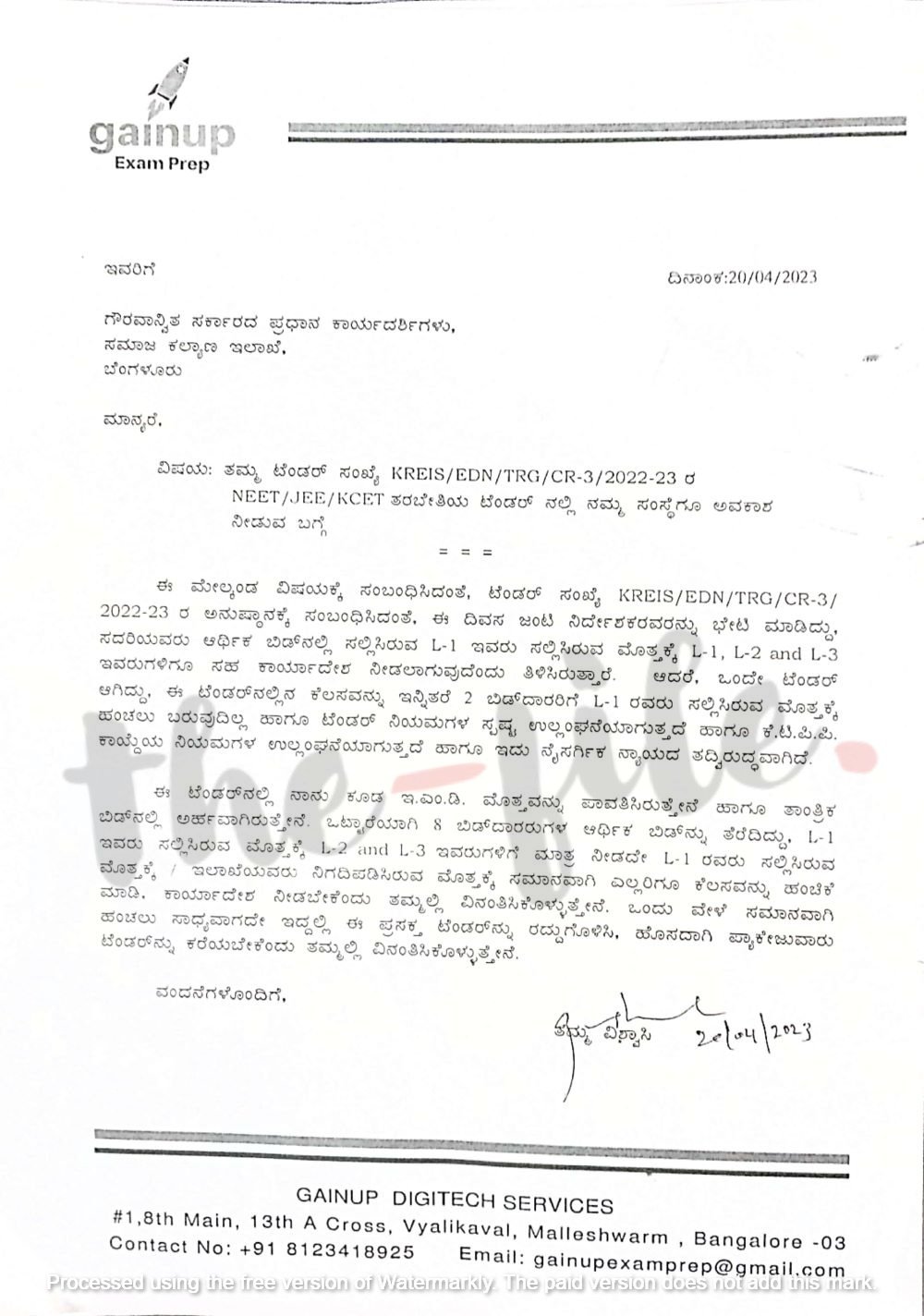 ಈ ಸಂಬಂಧ ಗೈನ್ ಅಪ್ ಖಾಸಗಿ ಕಂಪನಿಯು ಸಮಾಜ ಕಲ್ಯಾಣ ಇಲಾಖೆಯ ಸರ್ಕಾರದ ಪ್ರಧಾನ ಕಾರ್ಯದರ್ಶಿ ಮಣಿವಣ್ಣನ್ ಸೇರಿದಂತೆ ಇಲಾಖೆಯ ಆಯುಕ್ತರು, ಕಾರ್ಯನಿರ್ವಾಹಕ ನಿರ್ದೇಶಕರಿಗೆ ದಾಖಲೆ ಸಹಿತ ದೂರು ಸಲ್ಲಿಸಿದ್ದಾರೆ. ಈ ದೂರಿನ ಪ್ರತಿ ಮತ್ತು ಟೆಂಡರ್ ದಾಖಲಾತಿಗಳು ‘ದಿ ಫೈಲ್’ಗೆ ಲಭ್ಯವಾಗಿವೆ.