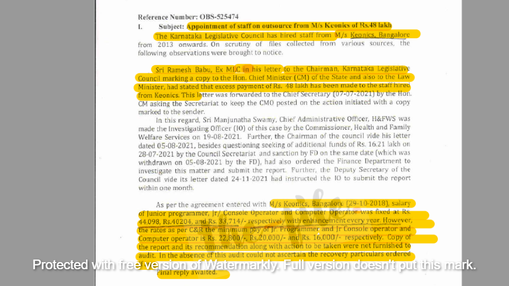 ಜ್ಯೂನಿಯರ್ ಪ್ರೋಗ್ರಾಮರ್, ಜ್ಯೂನಿಯರ್ ಕನ್ಸೋಲ್ ಆಪರೇಟರ್, ಕಂಪ್ಯೂಟರ್ ಆಪರೇಟರ್ಸ್, ಡಿಟಿಪಿ ಆಪರೇಟರ್ಸ್ಗಳನ್ನು ಹೊರಗುತ್ತಿಗೆ ಅಡಿಯಲ್ಲಿ ನೇಮಕ ಮಾಡಿರುವ ಪರಿಷತ್ ಸಚಿವಾಲಯವು ಕನಿಷ್ಠ ವೇತನ ಕಾಯ್ದೆಗಿಂತಲೂ ಹೆಚ್ಚುವರಿಯಾಗಿ ಕಳೆದ ಎರಡೂವರೆ ವರ್ಷಗಳಿಂದ 48,42,564 ರು.ಗಳನ್ನು ಪಾವತಿಸಿತ್ತು. ಇದನ್ನು ಆರ್ಥಿಕ ಇಲಾಖೆಯೂ ಆಕ್ಷೇಪಿಸಿತ್ತಲ್ಲದೇ ಈ ಕುರಿತು ಆರ್ಥಿಕ ಇಲಾಖೆಯ ಸರ್ಕಾರದ ಹೆಚ್ಚುವರಿ ಮುಖ್ಯ ಕಾರ್ಯದರ್ಶಿಗಳು 2021ರ ಏಪ್ರಿಲ್ 9ರಂದು ಸಚಿವಾಲಯದ ಕಾರ್ಯದರ್ಶಿಗೆ ಪತ್ರವನ್ನೂ ಬರೆದಿದ್ದರು.