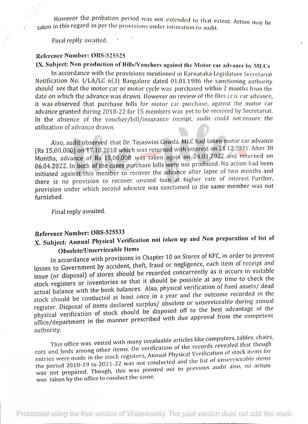 ಆದರೆ ‘ಡಾ ತೇಜಸ್ವಿನಿ ಗೌಡ ಅವರು ಮೋಟಾರು ಕಾರು ಖರೀದಿಸಲು 2018ರ ಅಕ್ಟೋಬರ್ 17ರಂದು 15 ಲಕ್ಷ ರು.ಗಳನ್ನು ಮುಂಗಡವಾಗಿ ಹಣ ಪಡೆದಿದ್ದರು. ಇದಾದ 38 ತಿಂಗಳ ನಂತರ ಪುನಃ ಮೋಟಾರು ವಾಹನ ಖರೀದಿಸಲು 2022ರ ಜನವರಿ 24ರಂದು ಮುಂಗಡ ಹಣ ಪಡೆದಿದ್ದರು. ಆದರೆ ಈ ಎರಡೂ ಪ್ರಕರಣಗಳಲ್ಲಿ ತೇಜಸ್ವಿನಿ ಗೌಡ ಅವರು ಮೋಟಾರು ಕಾರು ಖರೀದಿಗೆ ಸಂಬಂಧಿಸಿದಂತೆ ಬಿಲ್ಗಳನ್ನು ಸಲ್ಲಿಸಿರಲಿಲ್ಲ. ಅಲ್ಲದೆ ಇವರ ವಿರುದ್ಧ ಯಾವುದೇ ಕ್ರಮವನ್ನೂ ವಿಧಾನಪರಿಷತ್ ಸಚಿವಾಲಯವು ಕೈಗೊಂಡಿರಲಿಲ್ಲ,’ ಎಂಬ ಅಂಶವನ್ನು ಪ್ರಧಾನ ಮಹಾಲೇಖಪಾಲರ ತಪಾಸಣೆಯಲ್ಲಿ ಉಲ್ಲೇಖಿಸಿರುವುದು ತಿಳಿದು ಬಂದಿದೆ.