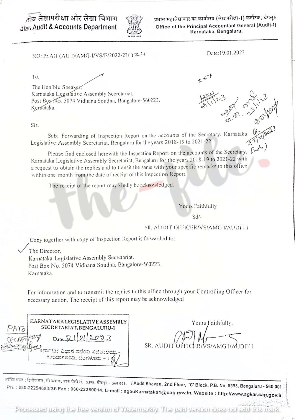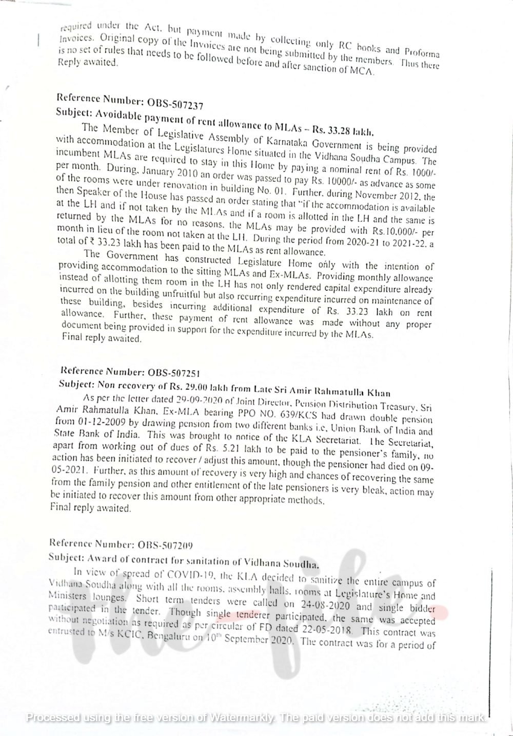 ಕೋವಿಡ್-19ರ ಅಲೆಯಲ್ಲಿ ವಿಧಾನಸಭೆ ಸಚಿವಾಲಯ ಮತ್ತು ಶಾಸಕರ ಭವನದ ಕೊಠಡಿಗಳಿಗೆ ಸ್ಯಾನಿಟೈಸೇಷನ್ ಮಾಡಿಸಲು ಬೃಹತ್ ಬೆಂಗಳೂರು ಮಹಾನಗರ ಪಾಲಿಕೆಯಿಂದ ಶಾಸಕರ ಭವನದ ಕೊಠಡಿಗಳಿಗೆ ಉಚಿತವಾಗಿ ಸ್ಯಾನಿಟೈಸೇಷನ್ ಮಾಡಿಸಲು ಇದ್ದ ಅವಕಾಶಗಳನ್ನೂ ಬದಿಗೊತ್ತಿ ಸಿಂಗಲ್ ಟೆಂಡರ್ನ್ನು ಅನುಮೋದಿಸಿರುವುದನ್ನೂ ತಪಾಸಣೆ ವರದಿಯಲ್ಲಿ ಆಕ್ಷೇಪಣೆ ಎತ್ತಲಾಗಿದೆ. ಈ ಸಂಬಂಧ ಭಾರತೀಯ ಲೆಕ್ಕಪರಿಶೋಧನೆ ಮತ್ತು ಲೆಕ್ಕಪತ್ರ ಇಲಾಖೆ ತಪಾಸಣೆ ವರದಿಯ ಪ್ರತಿಯು ‘ದಿ ಫೈಲ್’ಗೆ ಲಭ್ಯವಾಗಿದೆ.