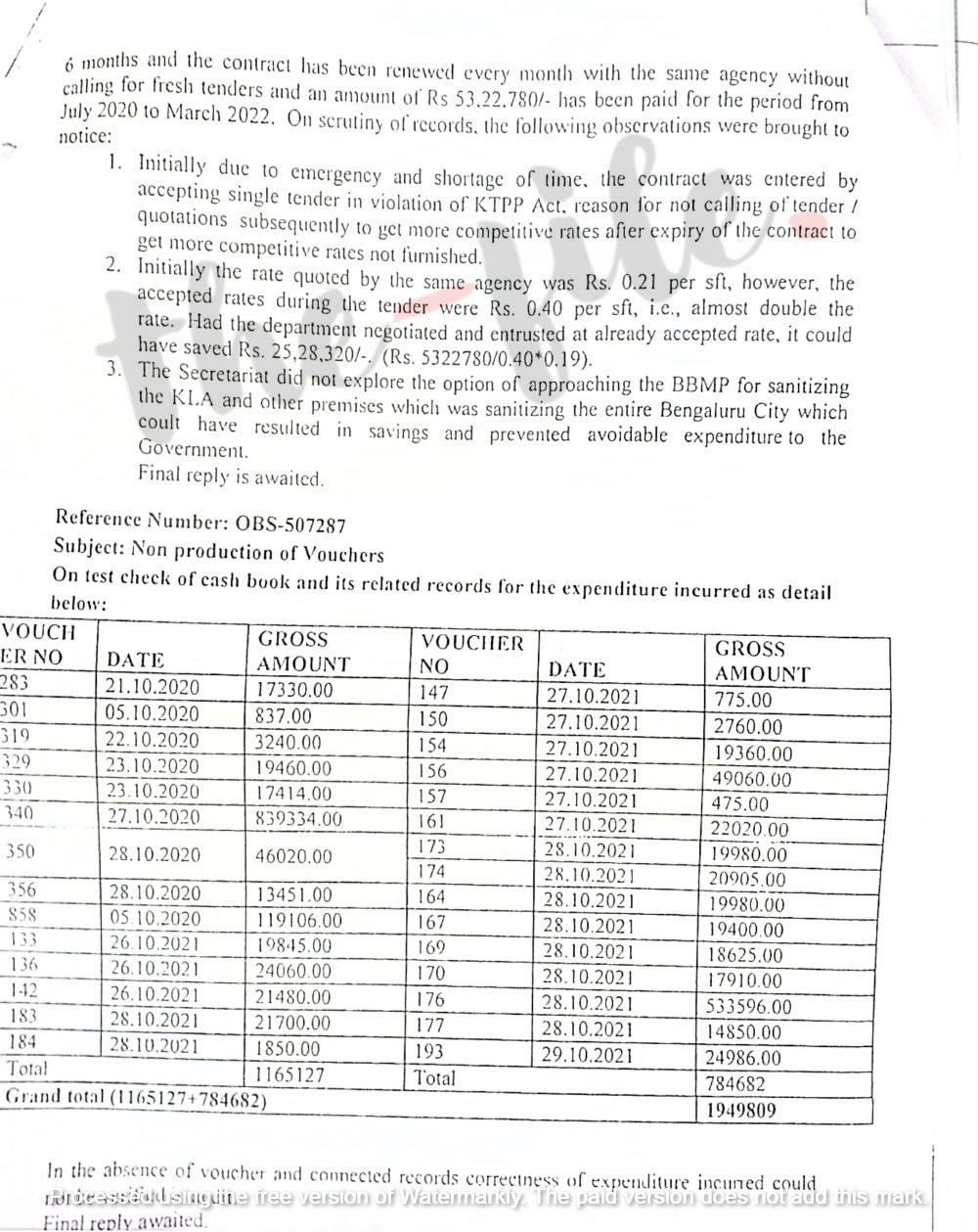 ವಿಧಾನಸಭೆ ಸಚಿವಾಲಯದ ಸ್ಪೀಕರ್ ಕೊಠಡಿ ಸೇರಿದಂತೆ ಸಚಿವಾಲಯದ ಕೊಠಡಿಗಳು, ಶಾಸಕರ ಭವನದ ಕೊಠಡಿಗಳಿಗೆ ಸ್ಯಾನಿಟೈಸೇಷನ್ ಮಾಡಿಸಲು 6 ತಿಂಗಳ ಅವಧಿಯ ಗುತ್ತಿಗೆ ಮಾಡಿಕೊಂಡಿತ್ತು. ಅಲ್ಲದೇ ಪ್ರತಿ ತಿಂಗಳೂ ಹೊಸದಾಗಿ ಟೆಂಡರ್ ಕರೆದು ನವೀಕರಿಸಬೇಕಾಗಿತ್ತು. ಆದರೆ ಹೊಸ ಟೆಂಡರ್ ಕರೆಯದೇ ಜುಲೈ 2020ರಿಂದ ಮಾರ್ಚ್ 2022ರವರೆಗೆ ಒಟ್ಟು 52,32,780 ರು.ಗಳನ್ನು ಕೆಸಿಐಸಿ ಕಂಪನಿಗೆ ಪಾವತಿಸಲಾಗಿತ್ತು ಎಂಬುದನ್ನು ತಪಾಸಣೆ ವರದಿಯು ಪತ್ತೆ ಹಚ್ಚಿದೆ.