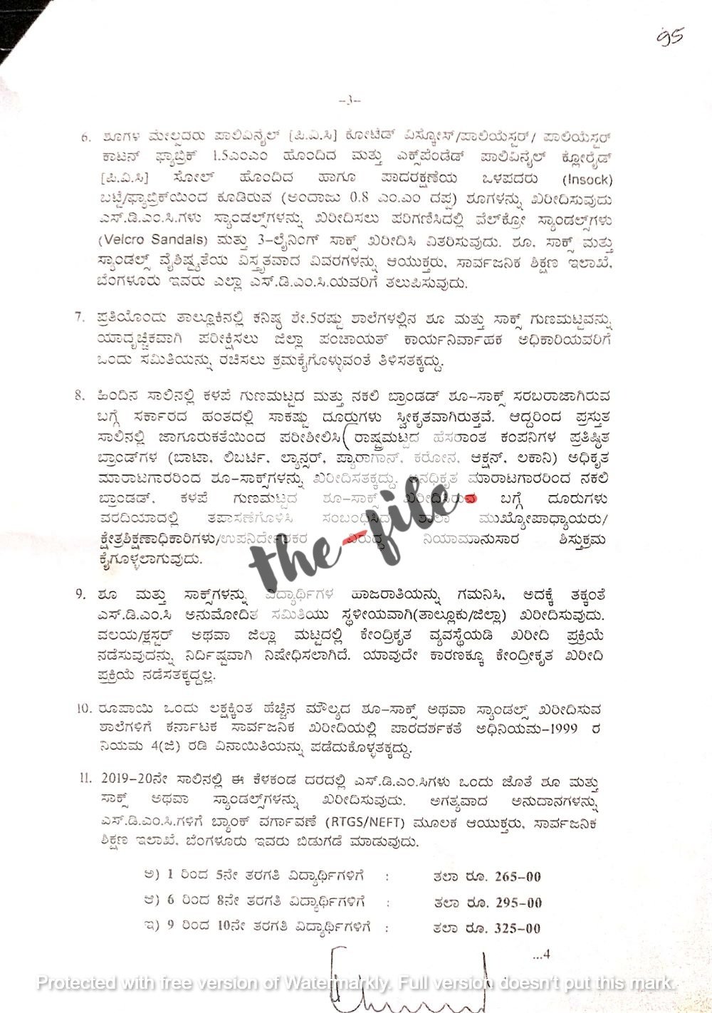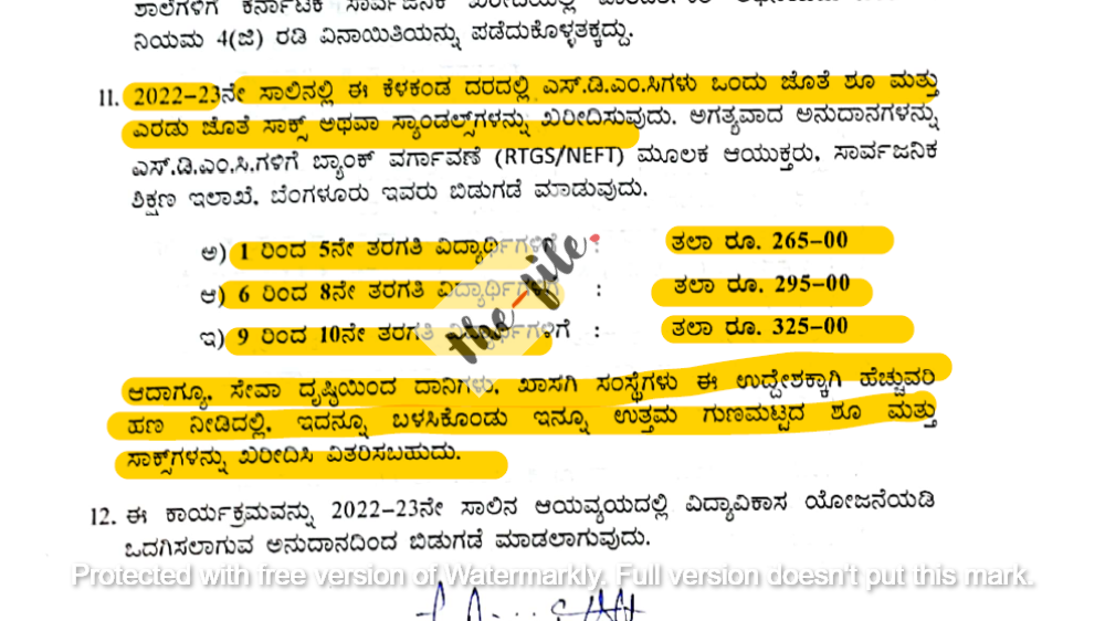 2017-18ನೇ ಸಾಲಿನಲ್ಲಿ 1 ರಿಂದ 10ನೇ ತರಗತಿಯಲ್ಲಿ ವ್ಯಾಸಂಗ ಮಾಡುತ್ತಿರುವ ವಿದ್ಯಾರ್ಥಿಗಳಿಗೆ ಶೂ ಮತ್ತು ಸಾಕ್ಸ್ ಖರೀದಿ ಸಂಬಂಧ ಶಾಲಾ ಎಸ್.ಡಿ.ಎಂ.ಸಿ ಖಾತೆಗಳಿಗೆ ರೂ.129.84 ಕೋಟಿ ಅನುದಾನವನ್ನು ಬಿಡುಗಡೆ ಮಾಡಿ ಹೊರಡಿಸಿದ್ದ ಆದೇಶದಲ್ಲಿದ್ದ ದರವನ್ನೇ 2022-23ನೇ ಸಾಲಿನಲ್ಲಿಯೂ ನಮೂದಿಸಿ ಪ್ರಸಕ್ತ ಸ್ಥಳೀಯ ಮಾರುಕಟ್ಟೆಯಲ್ಲಿನ ವಾಸ್ತವ ದರಗಳನ್ನು ಈಗಿನ ಕಾಂಗ್ರೆಸ್ ಸರ್ಕಾರವೂ ಪರಿಗಣಿಸಿಲ್ಲ ಎಂಬುದು ಮೇಲ್ನೋಟಕ್ಕೆ ಕಂಡು ಬಂದಿದೆ.
