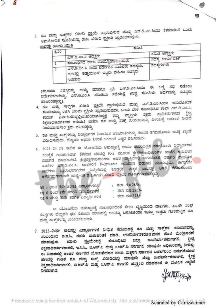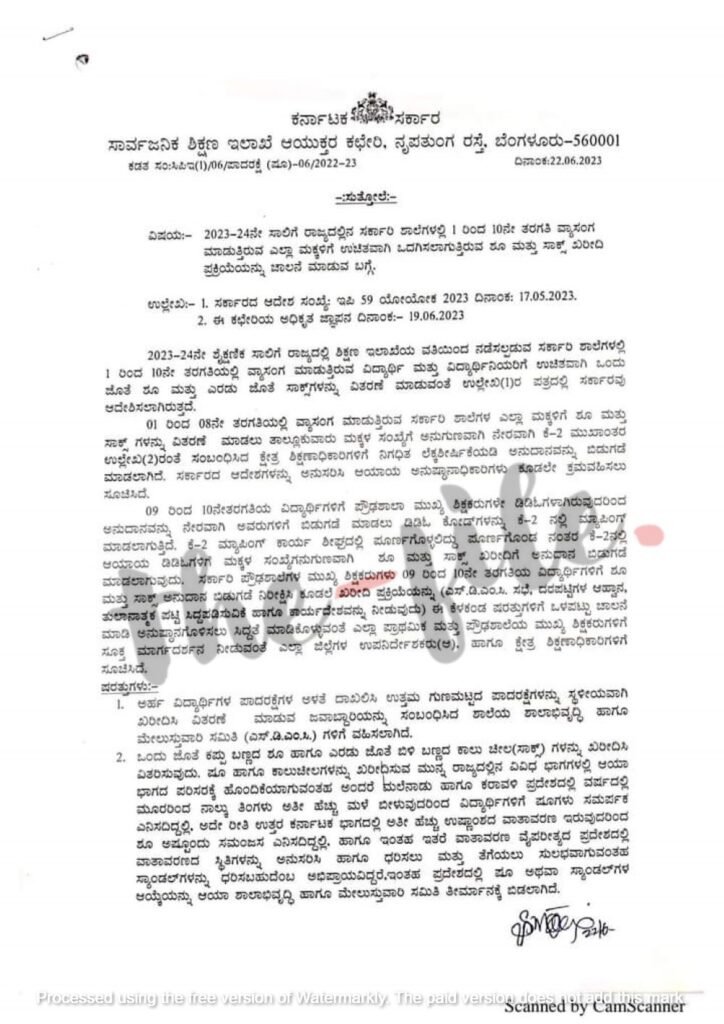 ಹಾಗೆಯೇ 09 ರಿಂದ 10ನೇ ತರಗತಿ ವಿದ್ಯಾರ್ಥಿಗಳಿಗೆ ಮಕ್ಕಳ ಸಂಖ್ಯೆಗೆ ಅನುಗುಣವಾಗಿ ಶೂ ಮತ್ತು ಸಾಕ್ಸ್ ಖರೀದಿಗೆ 2023ರ ಜೂನ್ 19ರ ಅಂತ್ಯದವರೆಗೂ ಅನುದಾನ ಬಿಡುಗಡೆ ಮಾಡಿಲ್ಲ ಎಂದು ತಿಳಿದು ಬಂದಿದೆ. ಆದರೆ ಖರೀದಿ ಪ್ರಕ್ರಿಯೆಯನ್ನು ಆರಂಭಿಸಬೇಕು ಎಂದು ಪ್ರೌಢಶಾಲೆ ಮುಖ್ಯ ಶಿಕ್ಷಕರುಗಳಿಗೆ ಶಾಲಾ ಶಿಕ್ಷಣ ಮತ್ತು ಸಾಕ್ಷರತಾ ಇಲಾಖೆಯ ಆಯುಕ್ತರ ಕಚೇರಿಯು ಅಧಿಕೃತ ಜ್ಞಾಪನ ಪತ್ರ ಹೊರಡಿಸಿದೆ ಎಂದು ತಿಳಿದು ಬಂದಿದೆ.