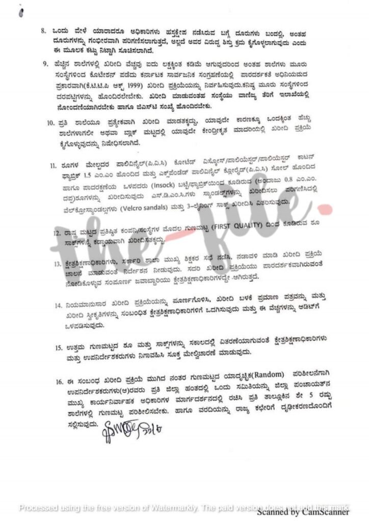 ‘2023-24ನೇ ಸಾಲಿನ ಈ ಯೋಜನೆ ಅನುಷ್ಠಾನಕ್ಕೆ ಆಯಾ ಶಾಲೆಗಳಲ್ಲಿನ ತರಗತಿವಾರು ವಿದ್ಯಾರ್ಥಿಗಳ ಸಂಖ್ಯೆಗೆ ಅನುಗುಣವಾಗಿ ಕೆ-2 ಮೂಲಕ ಕ್ಷೇತ್ರ ಶಿಕ್ಷಣಾಧಿಕಾರಿಗಳ ಖಾತೆಗೆ ಅನುದಾನ ಬಿಡುಗಡೆ ಮಾಡಲಾಗಿದೆ. ಈಗಾಗಲೇ ಶಾಲೆಗಳು ಪ್ರಾರಂಭವಾಗಿರುವ ಹಿನ್ನೆಲೆಯಲ್ಲಿ ಕೂಡಲೇ ಮಕ್ಕಳ ಪಾದರಕ್ಷೆ ಅಳತೆ ತೆಗೆದುಕೊಂಡು ಅಳತೆಗನುಗುಣವಾಗಿ ಜುಲೈ 30ರೊಳಗಾಗಿ ಖರೀದಿ ಪ್ರಕ್ರಿಯೆ ಪೂರ್ಣಗೊಳಿಸಬೇಕು,’ ಎಂದು 2023ರ ಜೂನ್ 22ರಂದು ಸಾರ್ವಜನಿಕ ಶಿಕ್ಷಣ ಇಲಾಖೆ ಆಯುಕ್ತರು ಸುತ್ತೋಲೆ ಹೊರಡಿಸಿದ್ದಾರೆ. ಜೂನ್ 22ರಂದು ಹೊರಡಿಸಿರುವ ಸುತ್ತೋಲೆಗೆ ಪ್ರಾಥಮಿಕ, ಪ್ರೌಢಶಿಕ್ಷಣ ಸಚಿವ ಮಧು ಬಂಗಾರಪ್ಪ ಅವರು ಅನುಮೋದಿಸಿದ್ದಾರೆ ಎಂದು ಗೊತ್ತಾಗಿದೆ. ಇದರ ಪ್ರತಿಯು ‘ದಿ ಫೈಲ್’ಗೆ ಲಭ್ಯವಾಗಿದೆ.