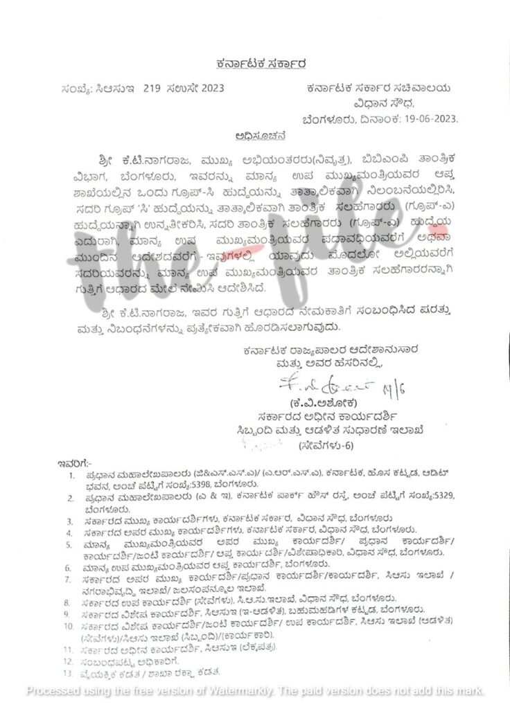 ಬಿಬಿಎಂಪಿಯ ತಾಂತ್ರಿಕ ವಿಭಾಗದ ಮುಖ್ಯ ಇಂಜನಿಯರ್ ಆಗಿದ್ದ ಕೆ ಟಿ ನಾಗರಾಜ ಅವರನ್ನು ಉಪ ಮುಖ್ಯಮಂತ್ರಿಯವರ ಆಪ್ತ ಶಾಖೆಯಲ್ಲಿ ಗ್ರೂಪ್ ಸಿ ಹುದ್ದೆಯನ್ನು ತಾತ್ಕಾಲಿಕವಾಗಿ ನಿಲಂಬನೆಯಲ್ಲಿರಿಸಿ ಈ ಗ್ರೂಪ್ ಸಿ ಹುದ್ದೆಯನ್ನು ತಾತ್ಕಾಲಿಕವಾಗಿ ತಾಂತ್ರಿಕ ಸಲಹೆಗಾರರು (ಗ್ರೂಪ್ ಎ) ಹುದ್ದೆಯನ್ನಾಗಿ ಉನ್ನತೀಕರಿಸಿ ಉಪ ಮುಖ್ಯಮಂತ್ರಿಯವರ ಪದಾವಧಿಯವರೆಗೆ ಅಥವಾ ಮುಂದಿನ ಆದೇಶದವರೆಗೆ ಇವುಗಳಲ್ಲಿ ಯಾವುದು ಮೊದಲೋ ಅಲ್ಲಿಯವರೆಗೆ ಇವರನ್ನು ಉಪ ಮುಖ್ಯಮಂತ್ರಿಯವರ ತಾಂತ್ರಿಕ ಸಲಹೆಗಾರರನ್ನಾಗಿ ಗುತ್ತಿಗೆ ಆಧಾರದ ಮೇಲೆ ನೇಮಿಸಿ ಆದೇಶಿಸಿದೆ ಎಂದು ಸಿಬ್ಬಂದಿ ಆಡಳಿತ ಸುಧಾರಣೆ ಇಲಾಖೆಯು 2023ರ ಜೂನ್ 19ರಂದು ಅಧಿಸೂಚನೆ ಹೊರಡಿಸಿದೆ. ಈ ಅಧಿಸೂಚನೆ ಪ್ರತಿಯು ‘ದಿ ಫೈಲ್’ಗೆ ಲಭ್ಯವಾಗಿದೆ.