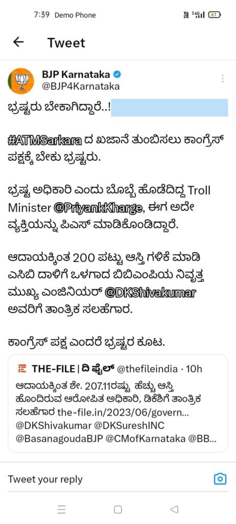 ಕೆ ಟಿ ನಾಗರಾಜ ಅವರನ್ನು ತಾಂತ್ರಿಕ ಸಲಹೆಗಾರರನ್ನಾಗಿ ನೇಮಿಸಿಕೊಂಡಿರುವುದನ್ನು ‘ದಿ ಫೈಲ್’ ಅಧಿಸೂಚನೆ ಸಹಿತ ಇಂದು ಬೆಳಗ್ಗೆ ವರದಿಯನ್ನು ಪ್ರಕಟಿಸಿತ್ತು. ಈ ವರದಿಯನ್ನು ಹಂಚಿಕೊಂಡಿರುವ ಬಿಜೆಪಿಯು ಭ್ರಷ್ಟರು ಬೇಕಾಗಿದ್ದಾರೆ..! ಎಂದು ಟ್ವೀಟ್ ಮಾಡಿದೆ. #ATMSarkara ದ ಖಜಾನೆ ತುಂಬಿಸಲು ಕಾಂಗ್ರೆಸ್ ಪಕ್ಷಕ್ಕೆ ಬೇಕು ಭ್ರಷ್ಟರು. ಭ್ರಷ್ಟ ಅಧಿಕಾರಿ ಎಂದು ಬೊಬ್ಬೆ ಹೊಡೆದಿದ್ದ Troll Minister @PriyankKharg , ಈಗ ಅದೇ ವ್ಯಕ್ತಿಯನ್ನು ಪಿಎಸ್ ಮಾಡಿಕೊಂಡಿದ್ದಾರೆ. ಆದಾಯಕ್ಕಿಂತ 200 ಪಟ್ಟು ಆಸ್ತಿ ಗಳಿಕೆ ಮಾಡಿ ಎಸಿಬಿ ದಾಳಿಗೆ ಒಳಗಾದ ಬಿಬಿಎಂಪಿಯ ನಿವೃತ್ತ ಮುಖ್ಯ ಎಂಜಿನಿಯರ್ @DKShivakumar ಅವರಿಗೆ ತಾಂತ್ರಿಕ ಸಲಹೆಗಾರ. ಕಾಂಗ್ರೆಸ್ ಪಕ್ಷ ಎಂದರೆ ಭ್ರಷ್ಟರ ಕೂಟ ಎಂದು ಜರಿದಿದೆ.