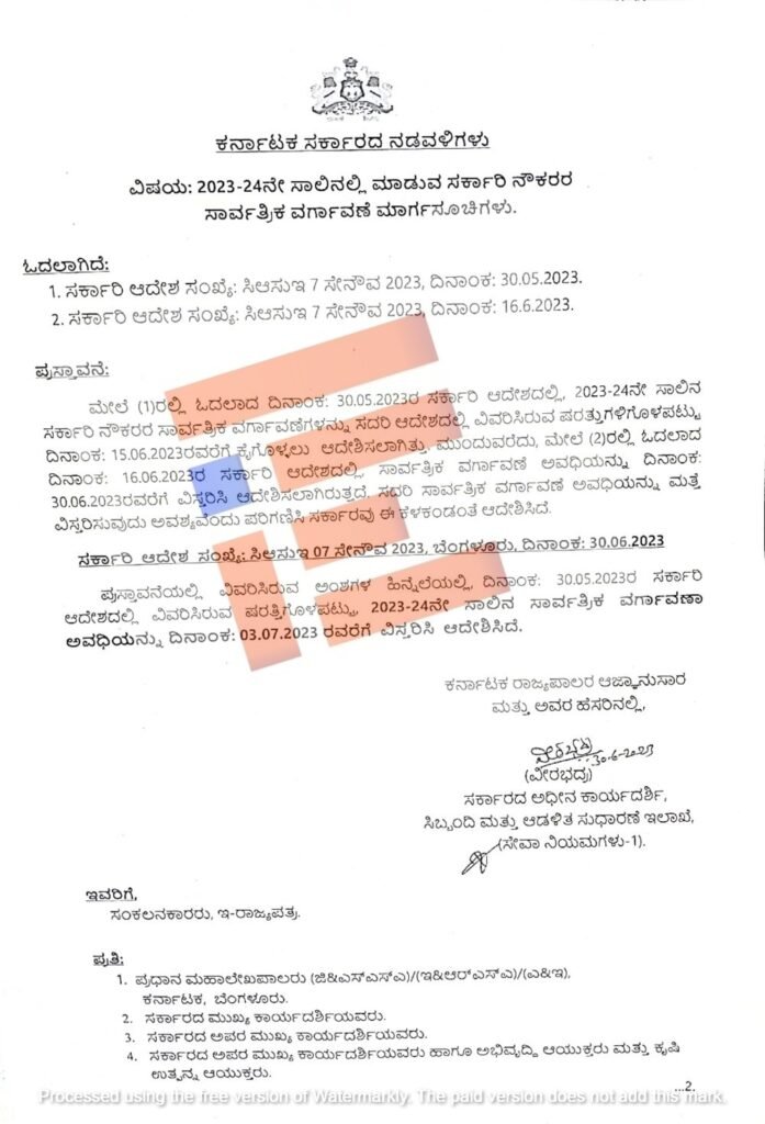 ಈ ಆದೇಶದ ಪ್ರಕಾರ ಜೂನ್ 1ರಿಂದ ಜೂನ್ 15ರವರೆಗೆ ವರ್ಗಾವಣೆ ಮಾಡಲು ಆಯಾ ಇಲಾಖೆ ಸಚಿವರಿಗೆ ಅಧಿಕಾರ ಪ್ರತ್ಯಾಯೋಜಿಸಲಾಗಿತ್ತು. ಇದಾದ ಮೇಲೆ ಸಾರ್ವತ್ರಿಕ ವರ್ಗಾವಣೆ ಅವಧಿಯನ್ನು ಪುನಃ 2023ರ ಜೂನ್ 30ರವರೆಗೆ ವಿಸ್ತರಿಸಿತ್ತು. ಆದರೂ ಮತ್ತೊಮ್ಮೆ ಅವಧಿಯನ್ನು ಜುಲೈ 3ರವರೆಗೆ ವಿಸ್ತರಿಸಿ 2023ರ ಜೂನ್ 30ರಂದು ಆದೇಶ ಹೊರಡಿಸಿತ್ತು.