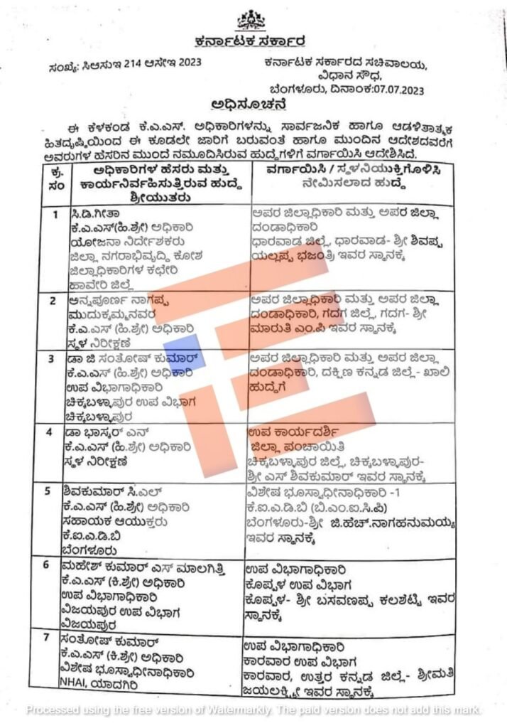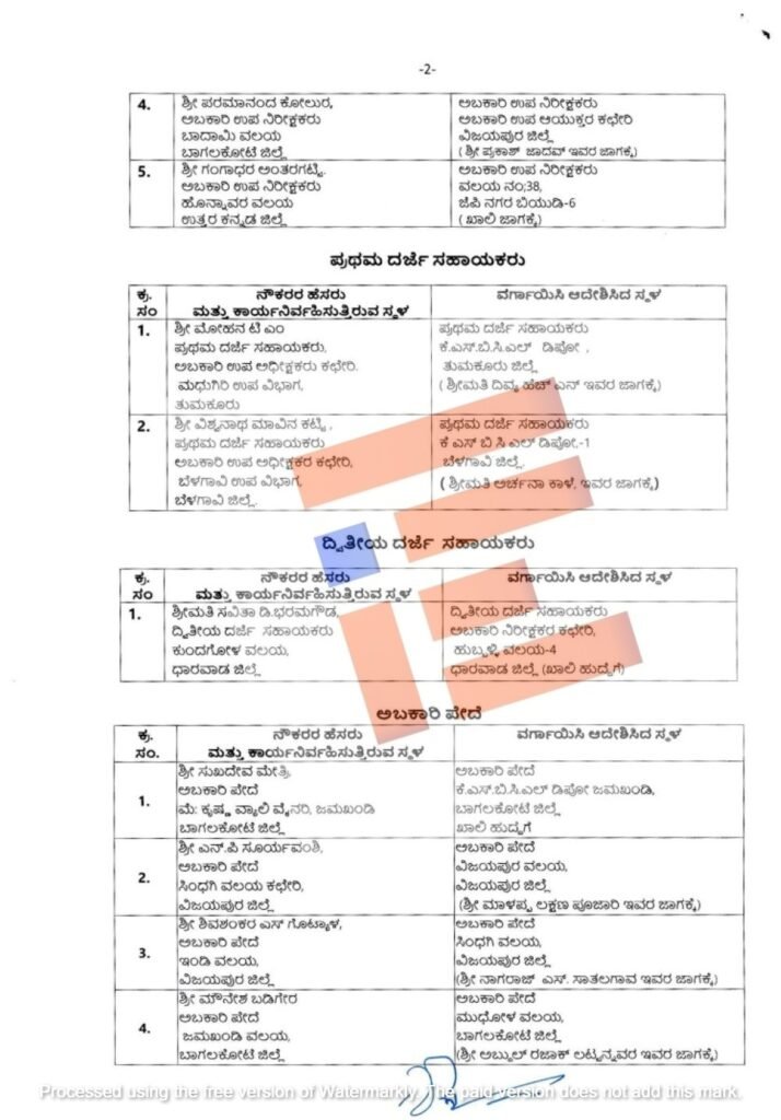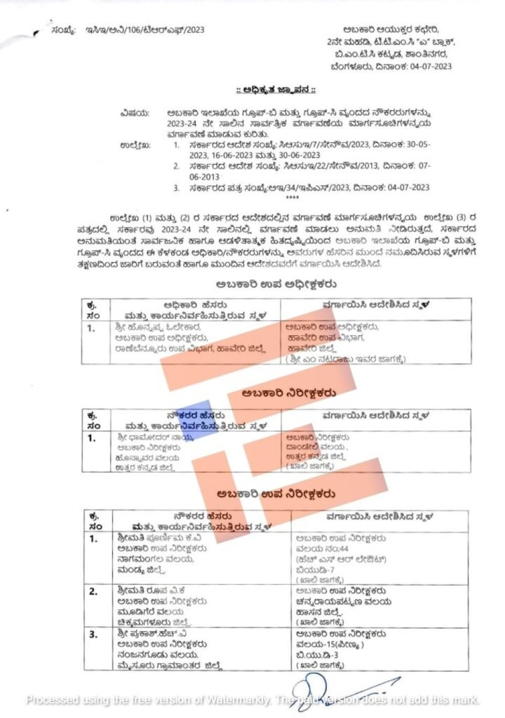 ಜುಲೈ 4 ಮತ್ತು 7ರಂದು ಹೊರಡಿಸಿರುವ ವರ್ಗಾವಣೆ ಆದೇಶ, ಅಧಿಸೂಚನೆಯಲ್ಲಿ ಕೆಎಎಸ್ (ಕಿರಿಯ ಶ್ರೇಣಿ), ಅಬಕಾರಿ ಅಧೀಕ್ಷಕರು, ಉಪಾಧೀಕ್ಷಕರು, ಶಾಲಾ ಶಿಕ್ಷಣ ಸಾಕ್ಷರತಾ ಇಲಾಖೆಯ ಪ್ರಥಮದರ್ಜೆ ಸಹಾಯಕರುಗಳಿದ್ದಾರೆ.